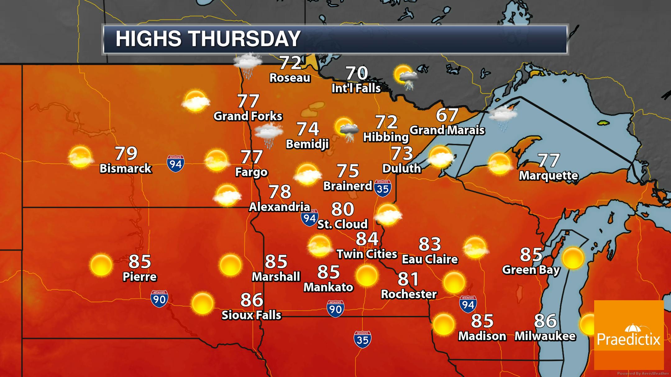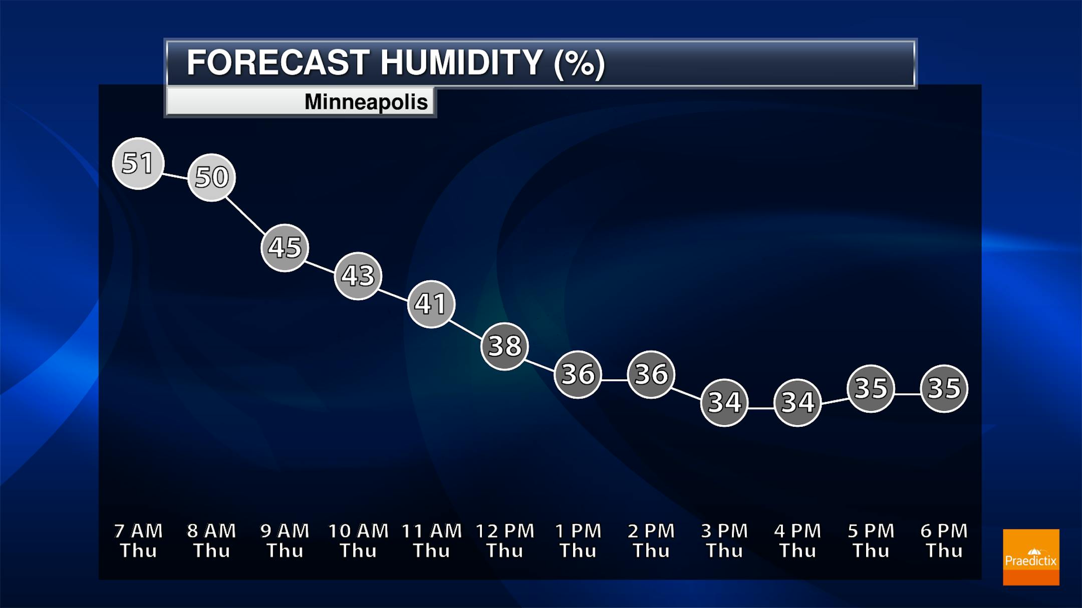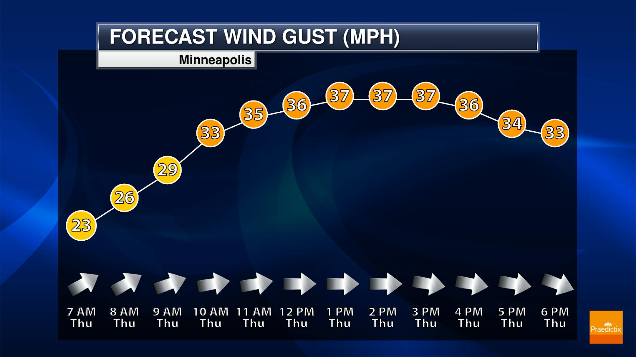 A warm day is expected on Thursday with mainly sunny skies in the Twin Cities as highs are expected to be about 5F degrees above average. It'll be a breezy day with sustained west winds at 10-25 mph and higher gusts.