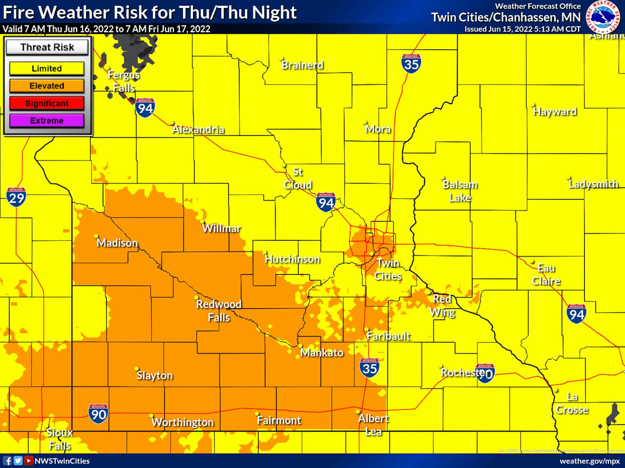 We will watch an elevated fire danger across southwestern/south-central Minnesota and into the Twin Cities metro Thursday with those very windy conditions and lower humidity values.