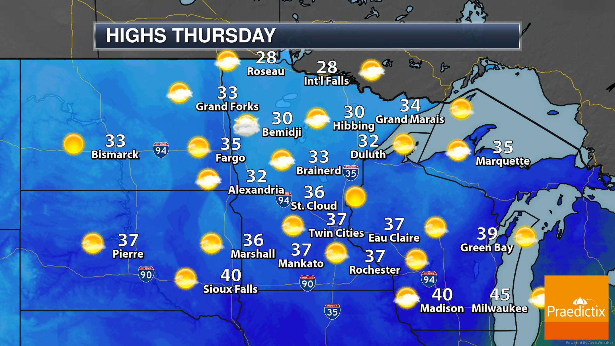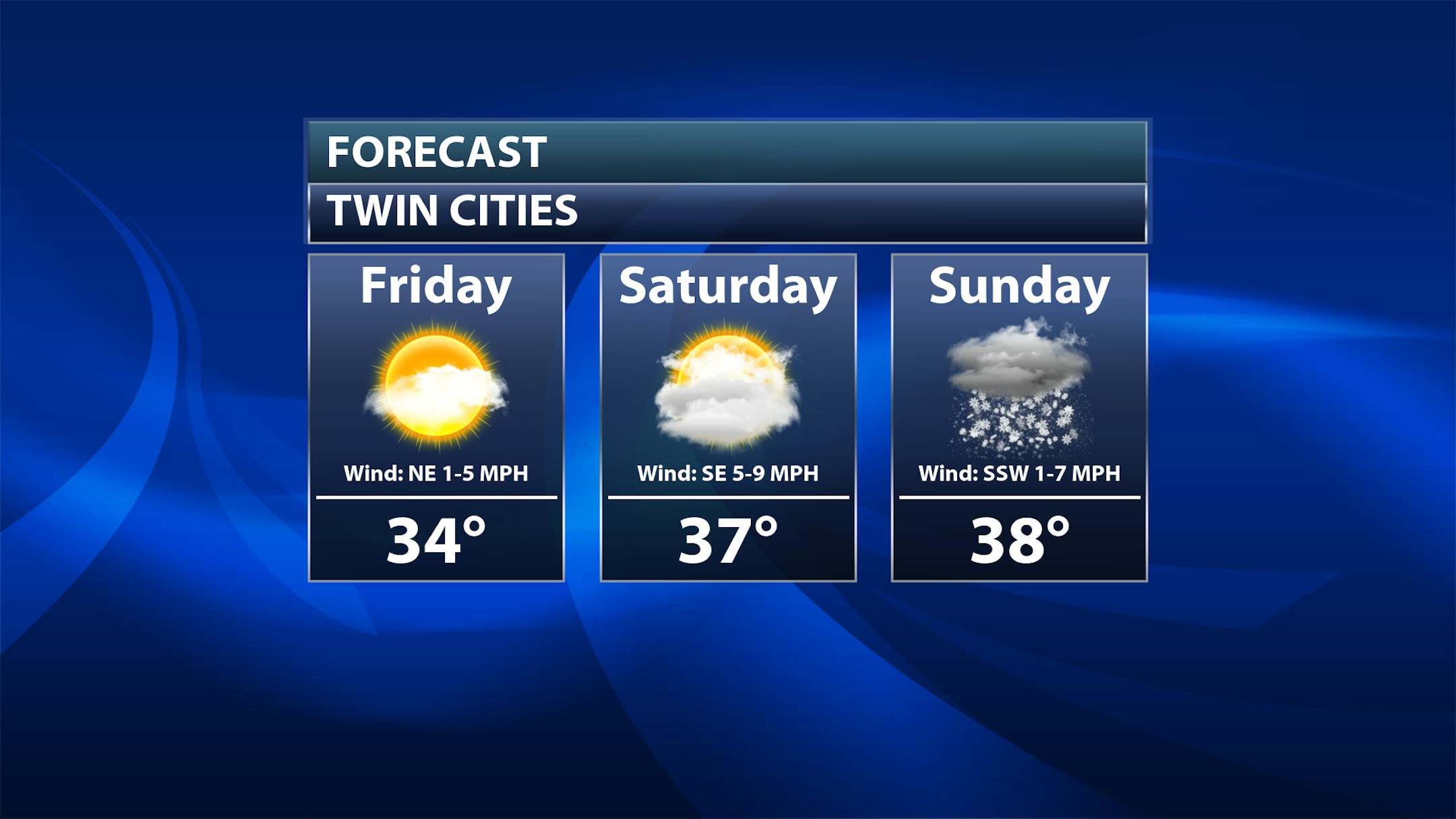 A few more clouds will be around throughout the day across northern parts of the state, otherwise, a mix of sun and clouds to mainly sunny conditions are expected across the southern two-thirds of Minnesota. Highs will range from the upper 20s in northern Minnesota to near 40F by Sioux Falls.