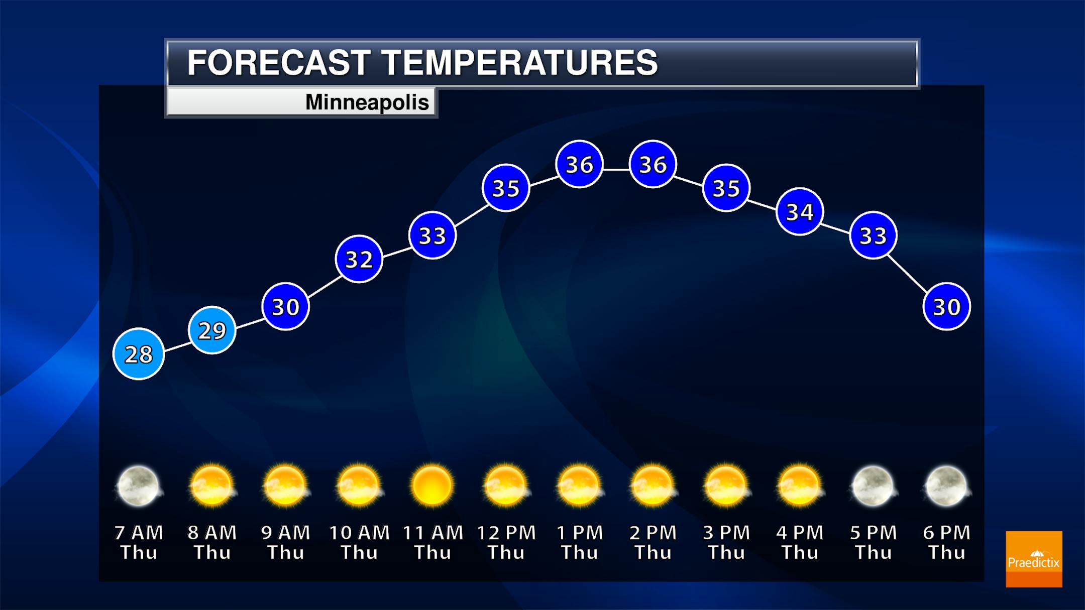 While we could begin (and end) the day with a few clouds around the metro, it will mostly be a sunny day with morning temperatures in the upper 20s and highs in the mid-30s.