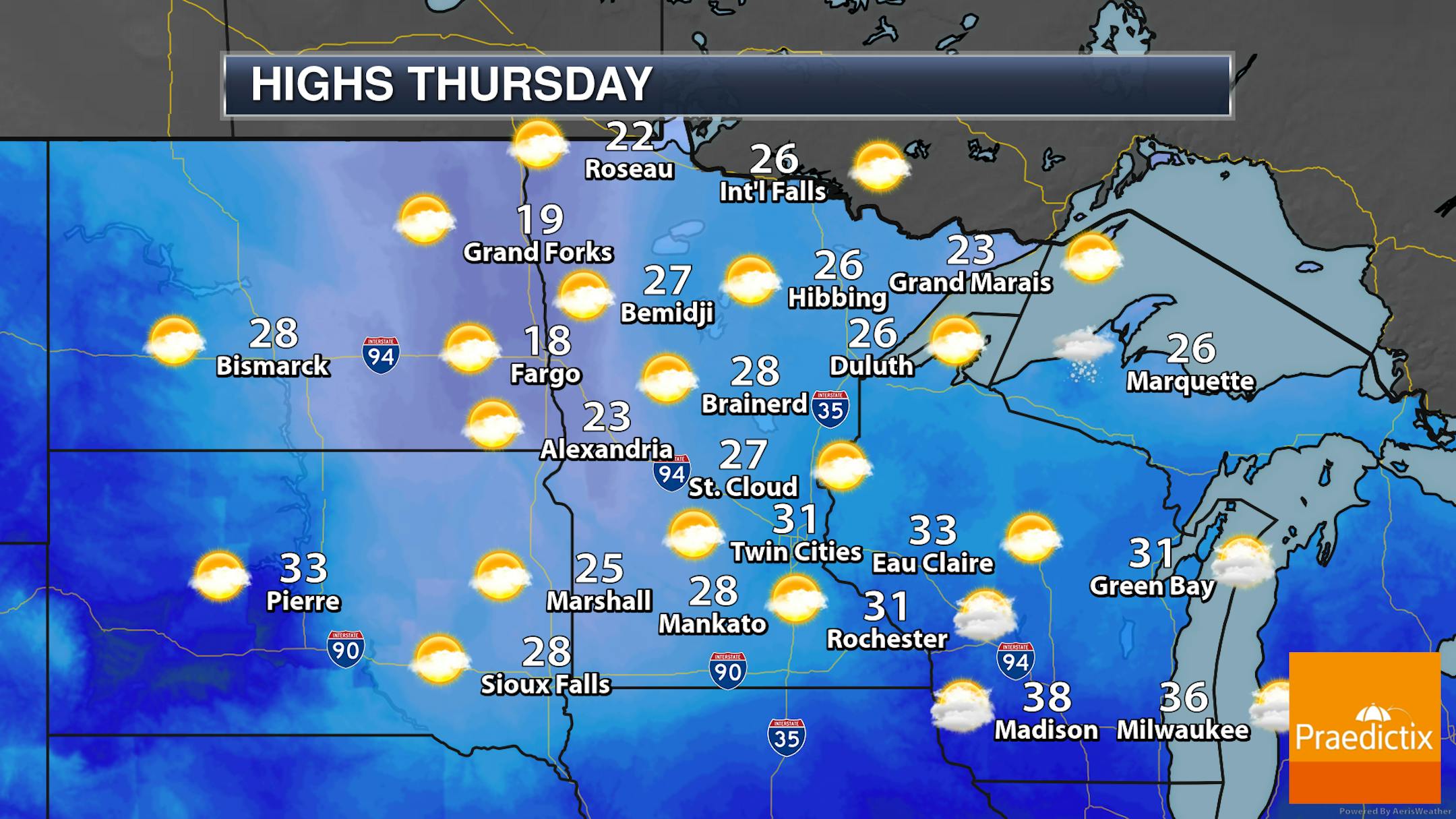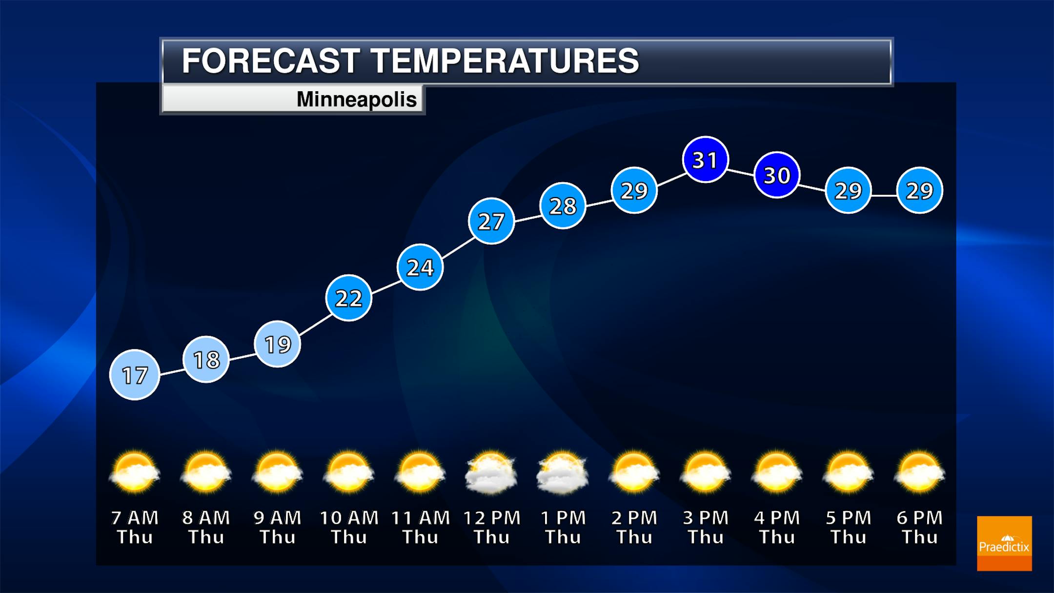 We'll see a mix of sun and clouds to mainly cloudy skies as we head through the day Thursday across the state. Highs will range from the teens in the Red River Valley to the low 30s in southeastern Minnesota.