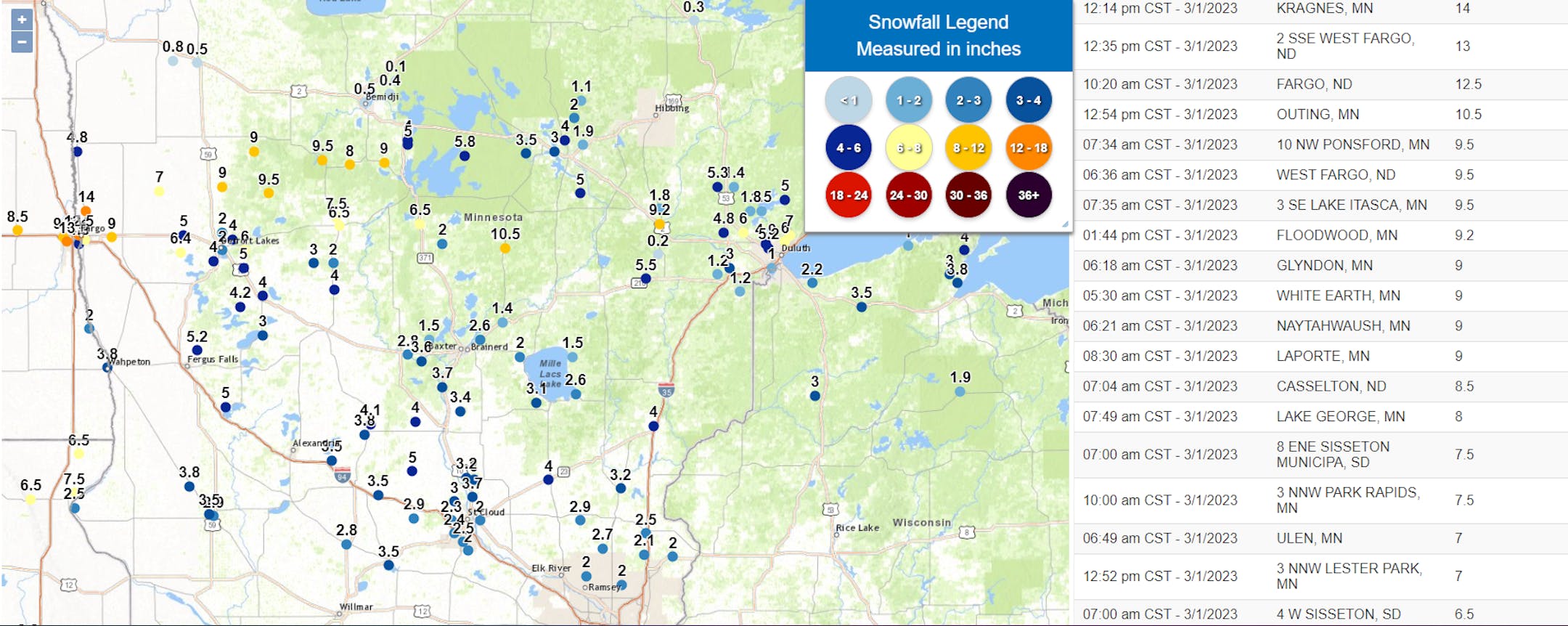 The clipper that moved through brought a widespread 2-5" of snow across portions of central Minnesota, however, heavier totals were found from near Fargo (with 14" in Kragnes) over to the Twin Ports (with ~6-7" in the Duluth area).