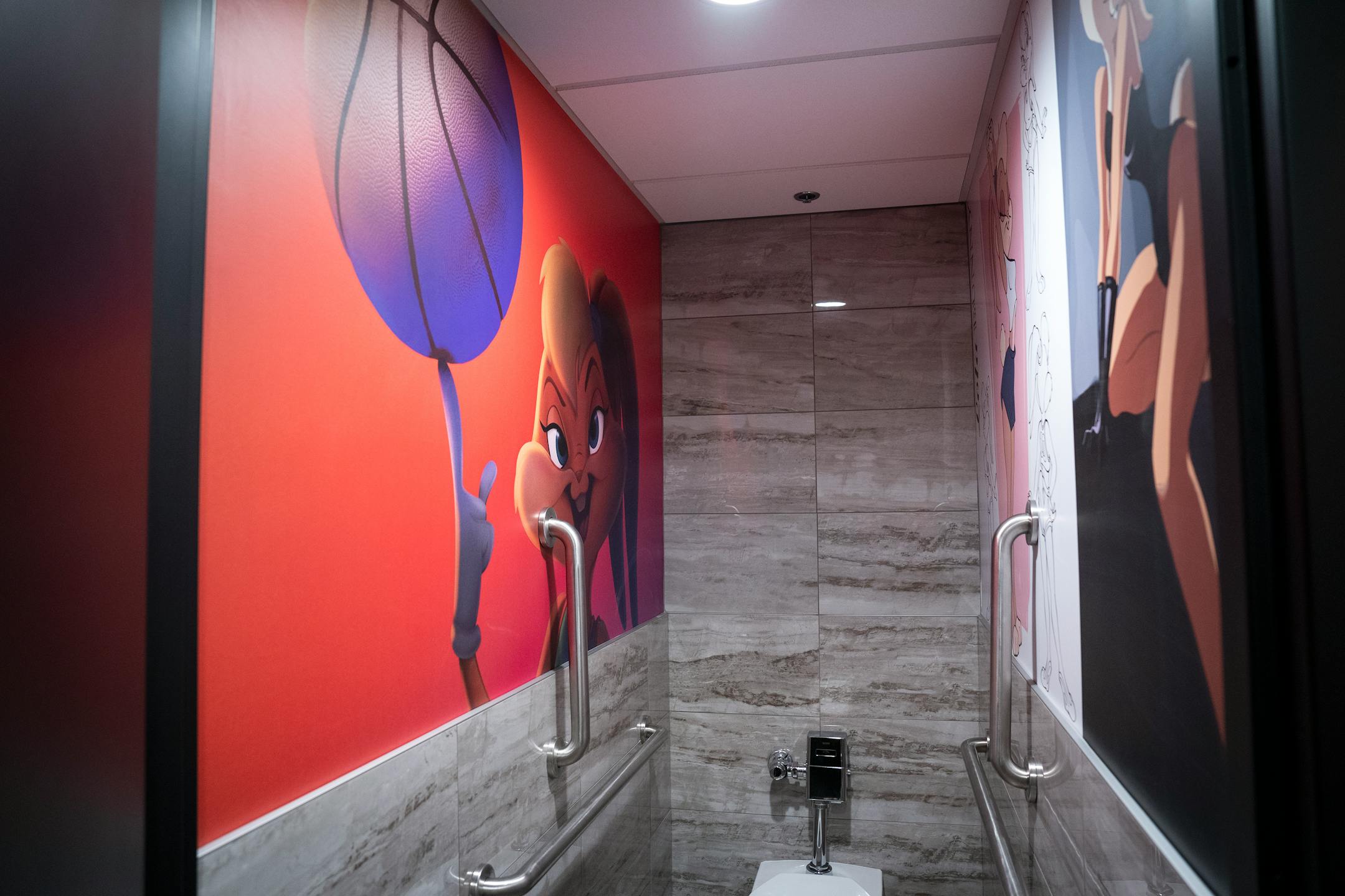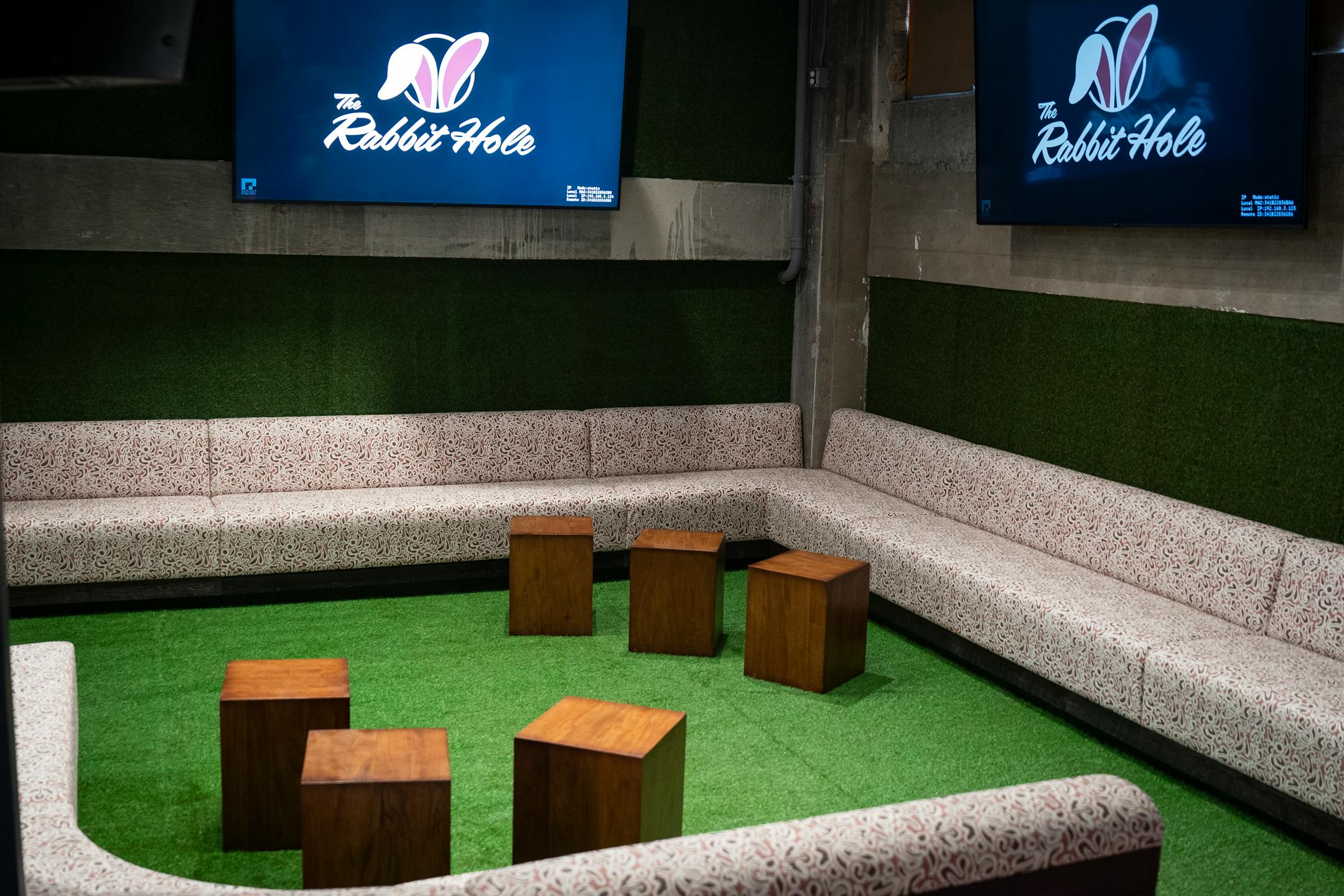 A pulltab counter, indoor turf, neon pink backlighting and a photo booth are also part of the sprawling space that will expand to include a tiered patio during the warm-weather months. Custom pop culture wallpaper in the bathrooms gives a nod to famous bunnies, such as those from “Alice in Wonderland” and Looney Tunes.