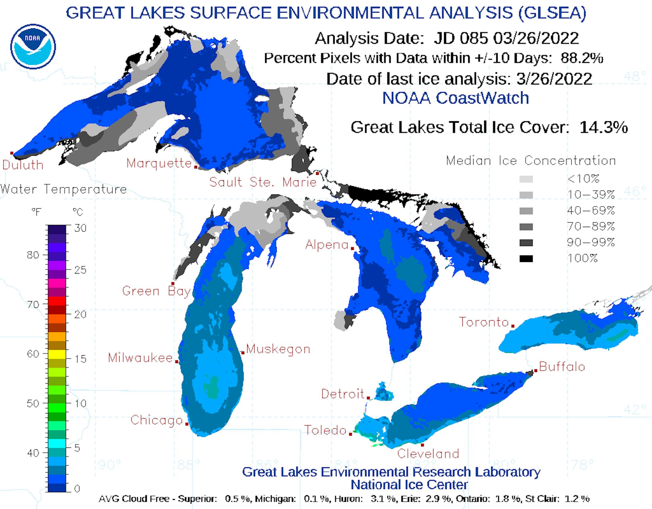 According to NOAA's GLERL, near 14% of the great lakes is considered ice covered. 22% of Lake Superior is ice covered.
