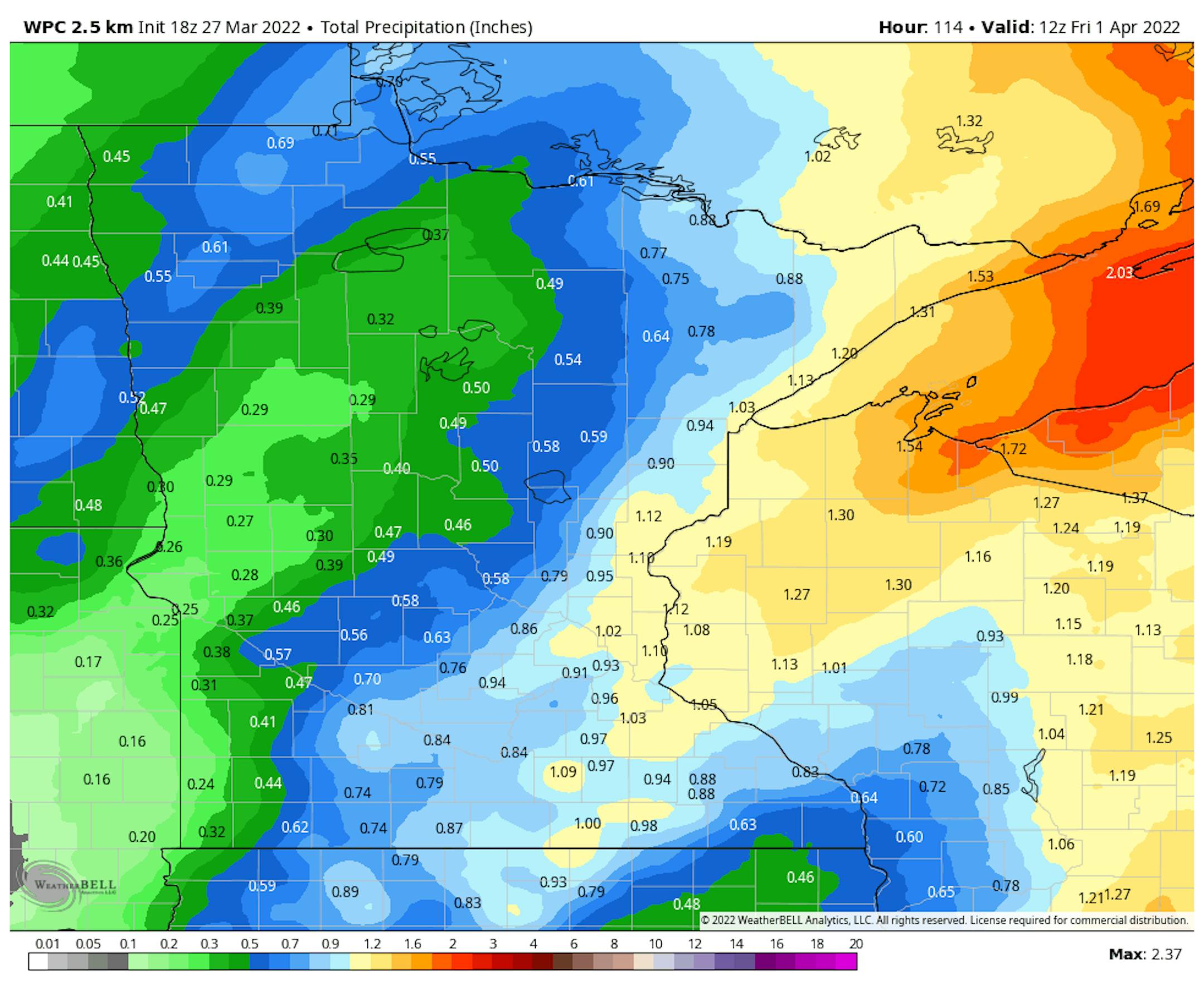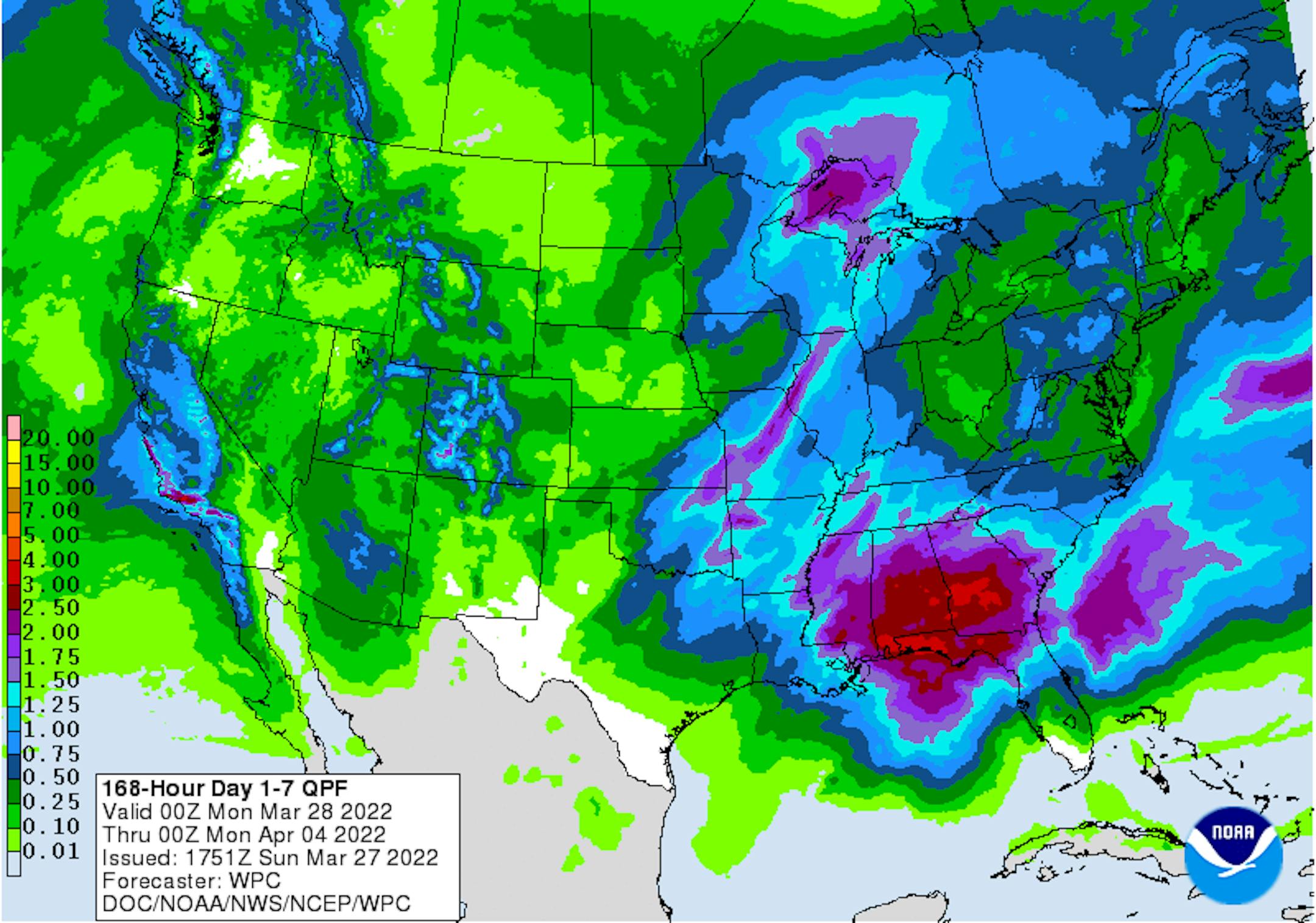 Here's NOAA's WPC extended precipitation outlook through Friday of next week. Early estimates suggest a pretty waterlogged storm system moving through with up to or more than 1" of liquid possible. Stay tuned...