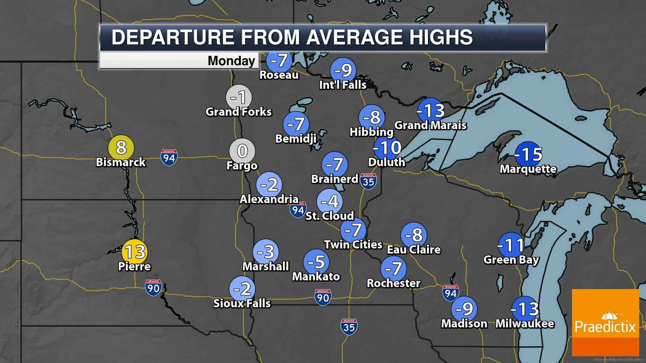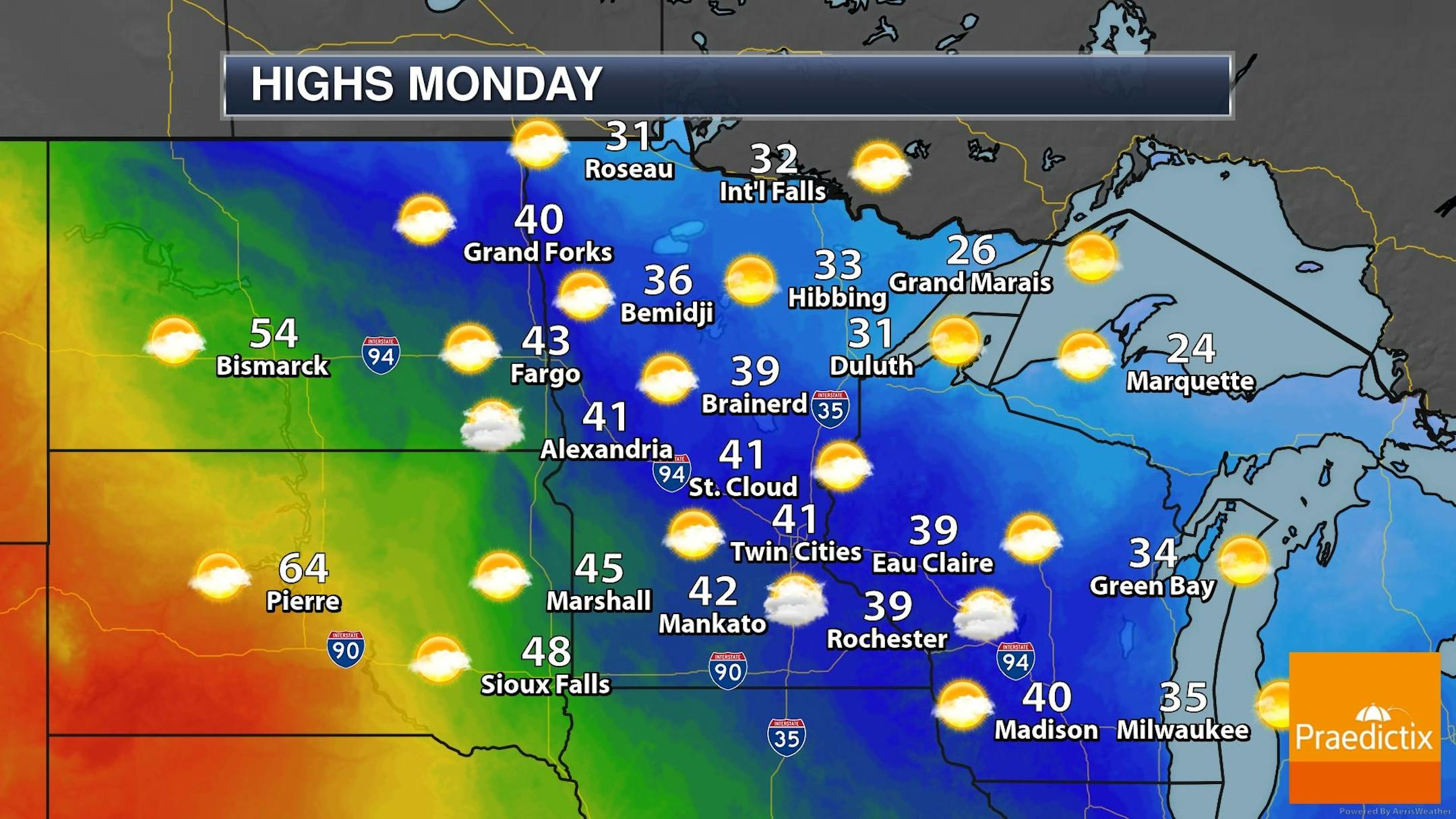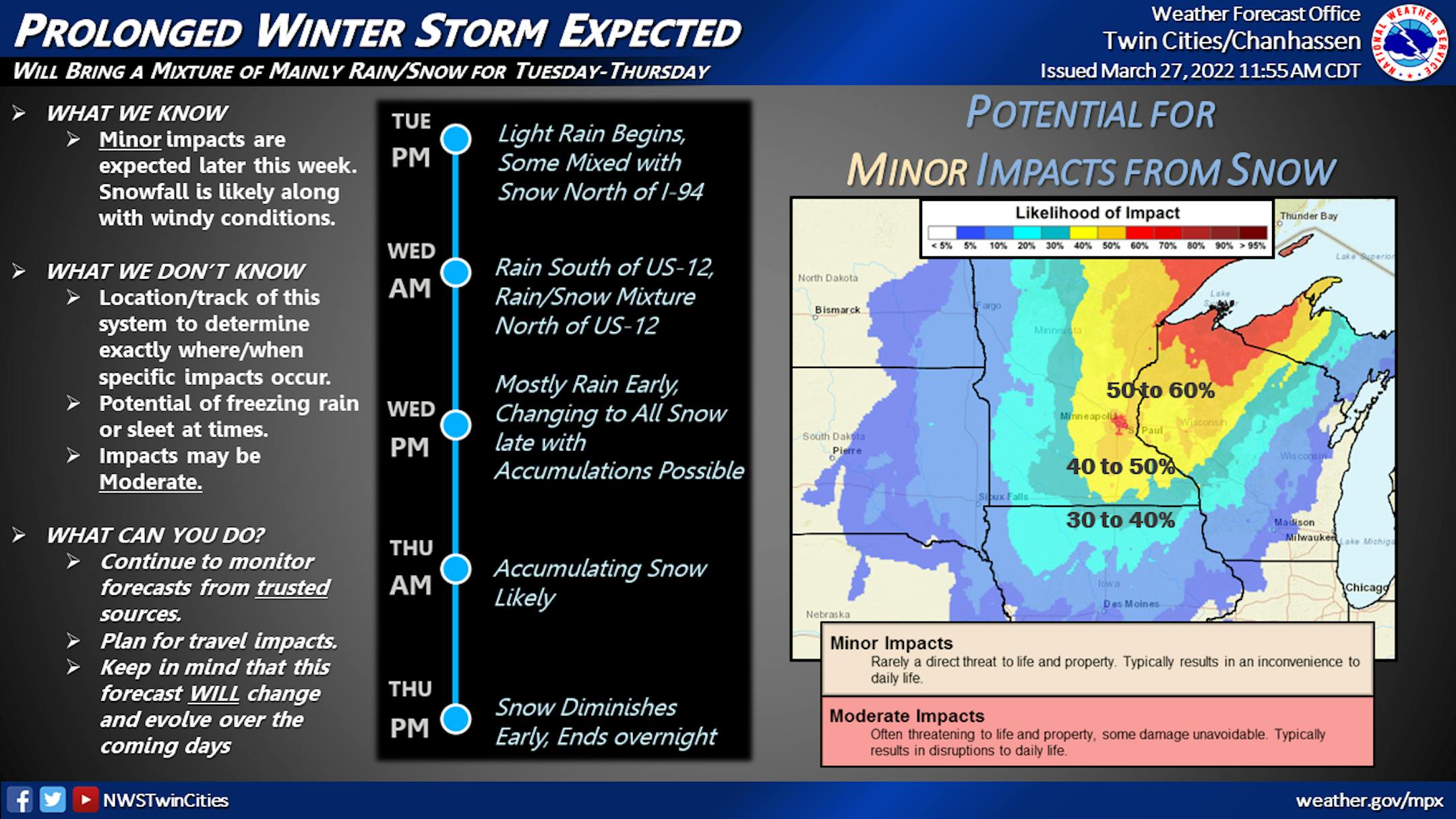 "There is growing potential for an impactful prolonged weather event across all of Minnesota and Wisconsin Tuesday afternoon through Thursday afternoon. There looks to be a variety of precipitation types, mainly rain and snow but possibly pockets of freezing rain or sleet. There will also be potential for accumulating snow and breezy conditions during the latter stages of this system. There are still many uncertain pieces of the forecast with this system, including the track and timing which would determine specific impacts, so please continue to monitor trusted sources for the latest forecasts and updates with this upcoming system."