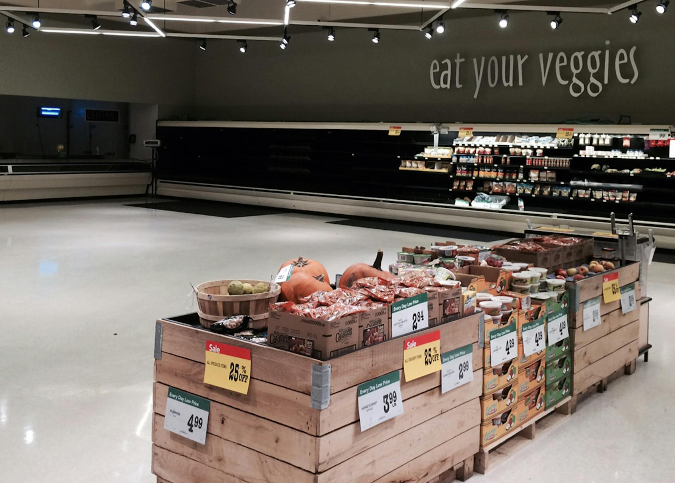 The entire produce section is cleared at both stores, leaving only a few seed balls and bottles of salad dressing. The meat and dairy departments are picked over too. But most grocery and personal hygiene aisles still had plenty to choose from.