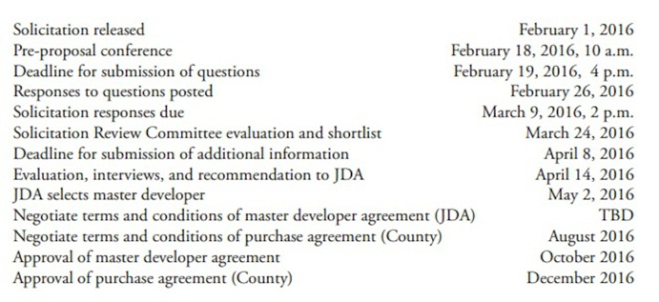 The JDA hopes to select a master developer by May 2. Below are other key dates within the process.