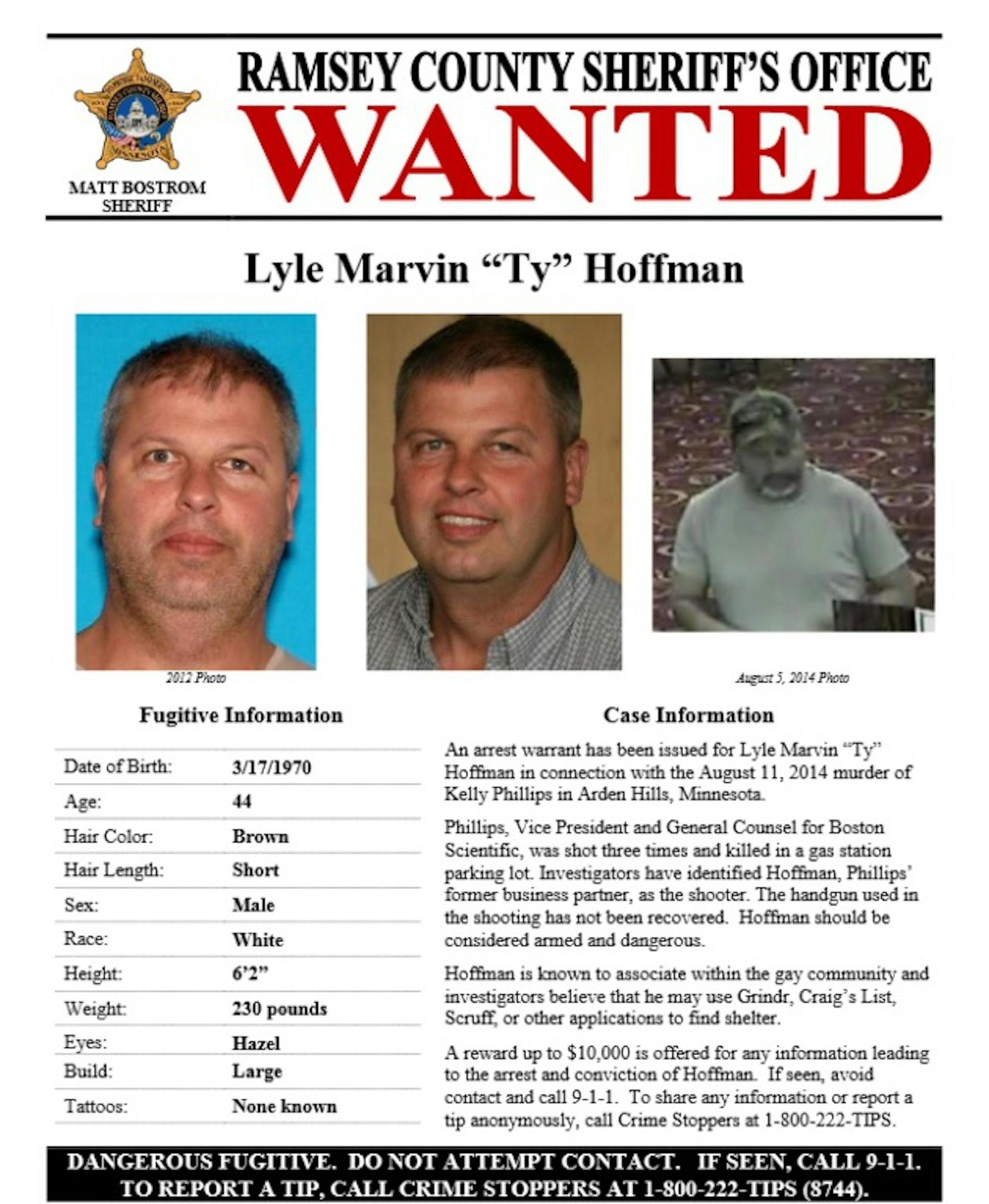 The Ramsey County Sheriff's Office issued a new poster for Lyle Marvin "Ty" Hoffman, who is wanted in connection with the August 11 slaying of Kelly Phillips, 48, an attorney and Boston Scientific vice president. Hoffman, 44, was charged with one count of intentional second-degree murder in Ramsey County District Court last week in the case.