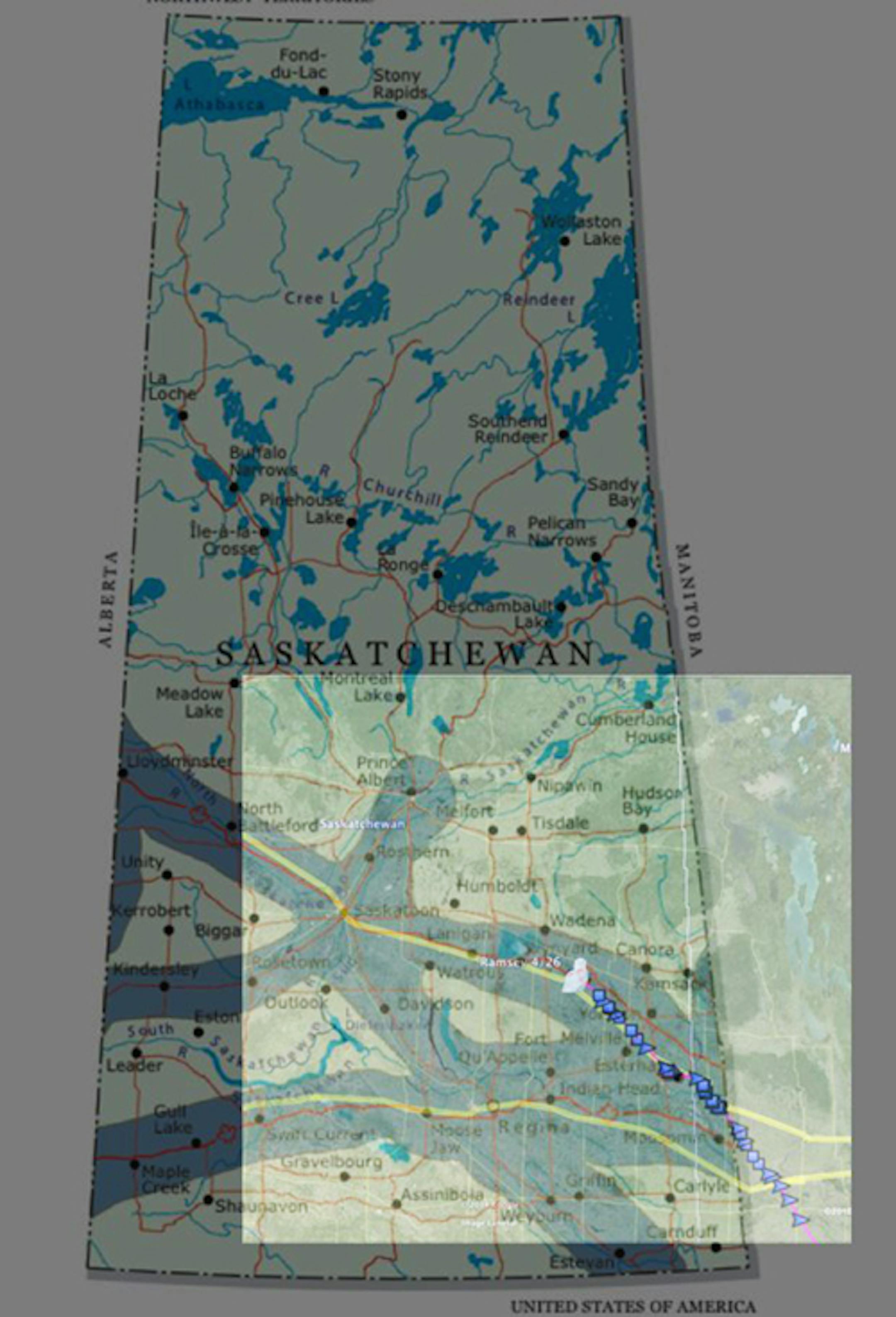 "The map below shows Ramsey's position and GSM cell coverage in Saskatchewan.