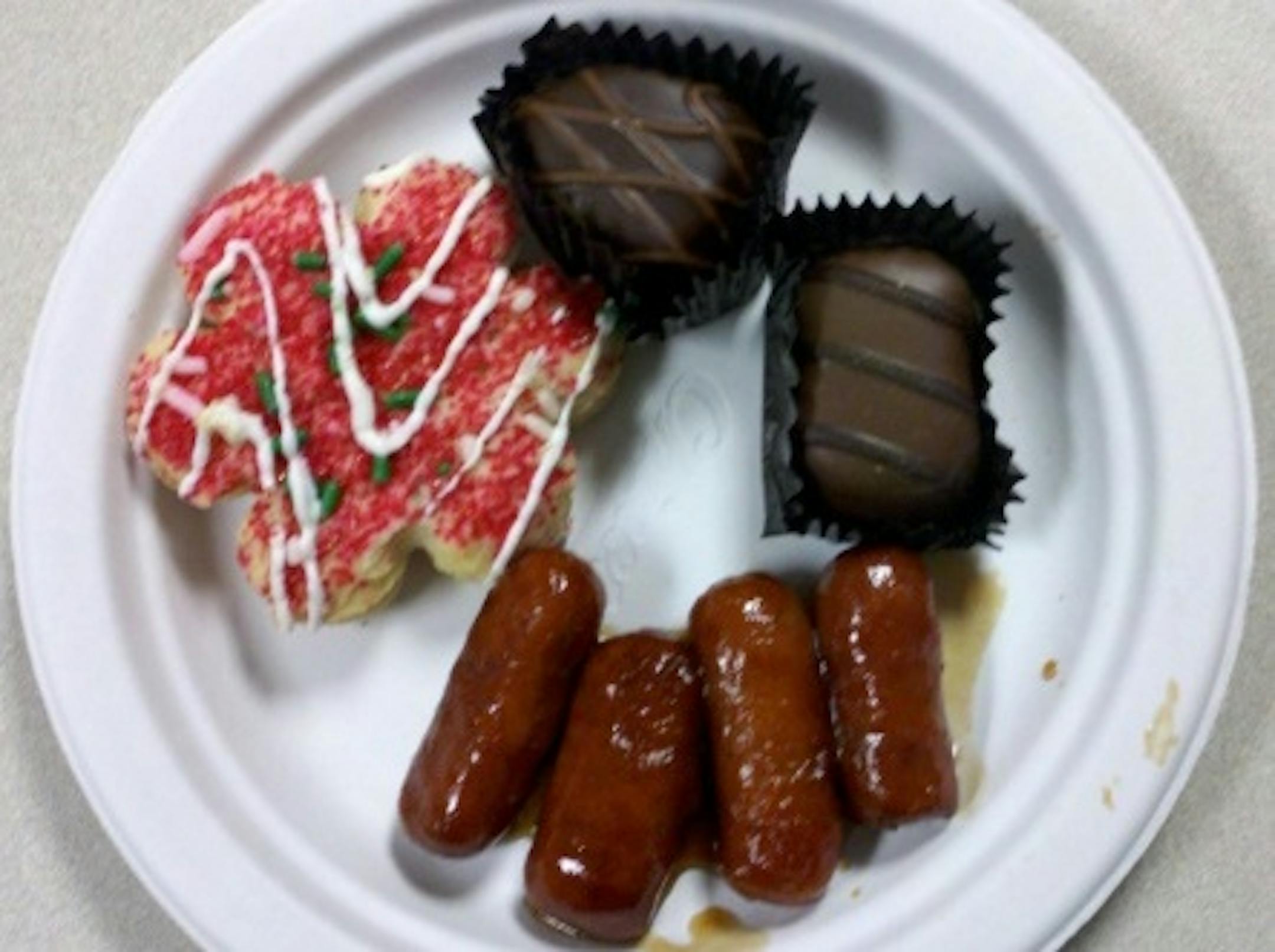 Editor's note: Jon Marthaler called us last night for a 30-minute Q&A session to commemorate four years of this blog's existence (the exact birthday was over the past weekend, but whatever). He transcribed what we said. Let it be known there were questions that prompted these answers. Those, however, were not included. As such, this reads like some sort of free-flowing stream of consciousness -- thoughts on the blog off the top of our head. Which, we suppose, is appropriate. The whole thing is pretty apt, actually. Here we go, from Marthaler (photo of our plate from today's holiday party at work. Yes, that's a cookie, two chocolates and four BBQ cocktail wieners):