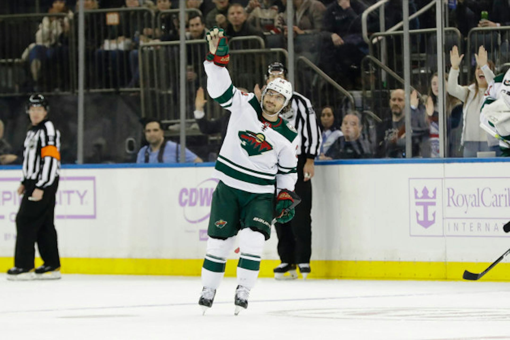 Before puck drop, fans lined up along the Wild's end of the rink and welcomed Zuccarello to the ice by holding up signs and his jersey. Others banged on the glass when he skated near them.