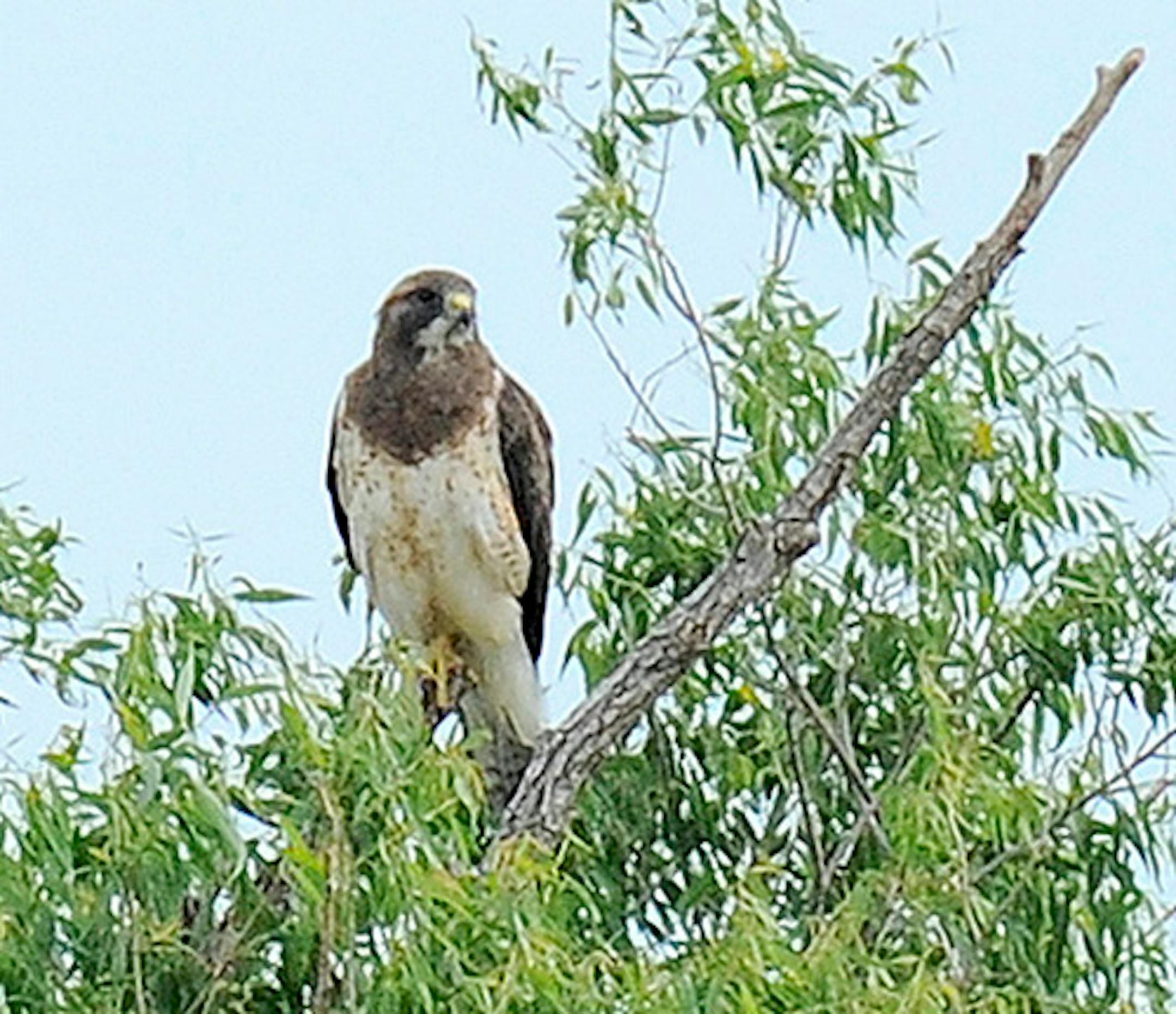 Swainson's Hawks come in various shades of color, dark to light, as do most raptors. They can range from very dark to quite light, as is the individual below. Dark birds are called melanistic. Their feathers contain more than the usual amount of melanin pigments. This bird is simply pale, perhaps leucistic, a condition where pigment is less. That is more often seen in patches on a bird. Albinism is complete lack off pigmentation, a genetic condition. The photo of the bird in the tree shows the more usual plumage of an adult Swainson's Hawk. The photos were taken recently in North Dakota. The light bird was being harassed by Common Grackles.