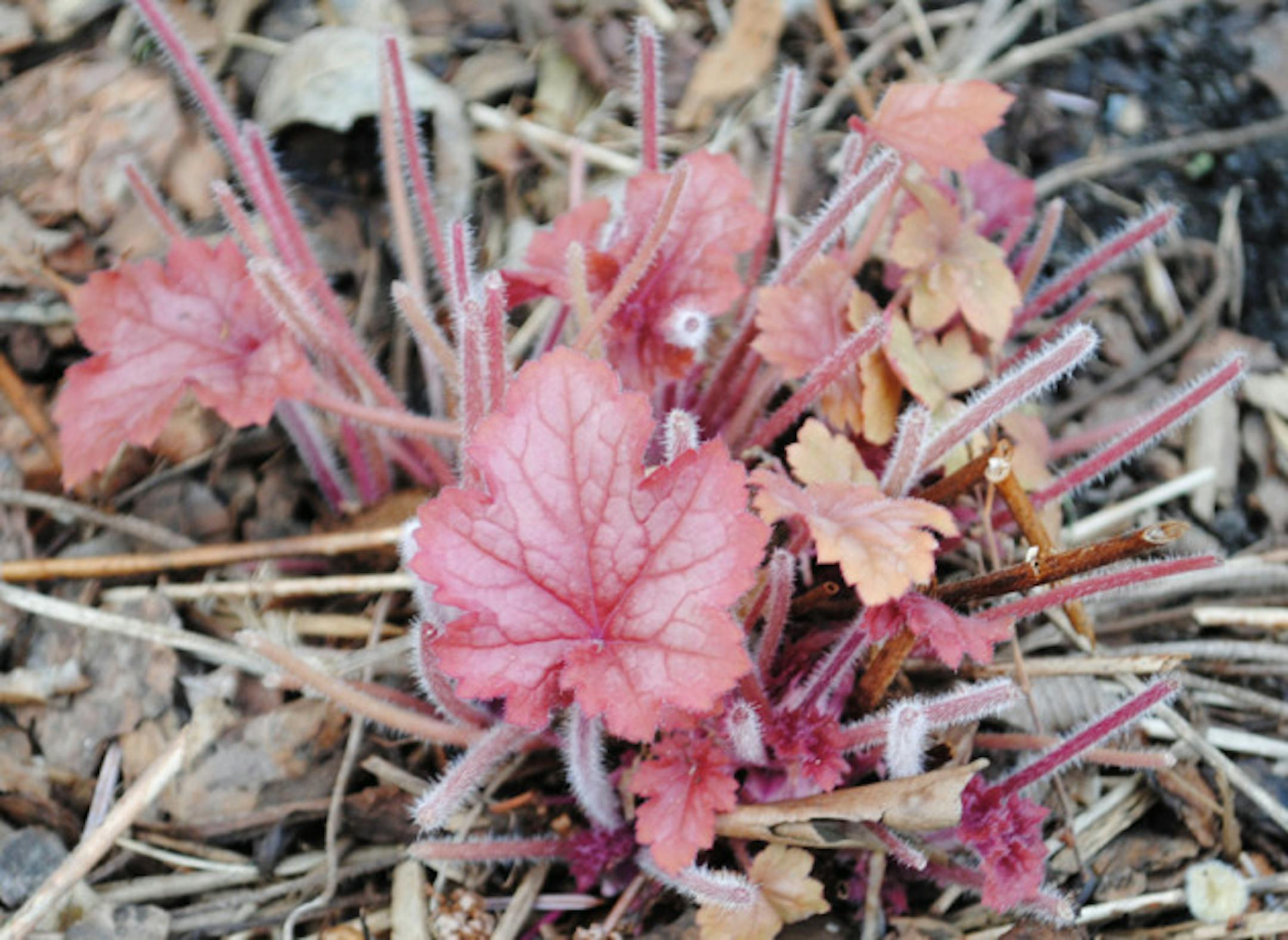 It's one thing to strive to be the hostess with the mostest, but it's another thing to find yourself extending lavish hospitality in the form of a bunny buffet. These uninvited guests, who naturally think we're the interlopers in their territory, have been observing their usual spring rituals of razing my heucheras, like the one below, and treating the hosta bed like a salad bar. (Why is it they leave the generic hosta alone and go for the more expensive rarities?)