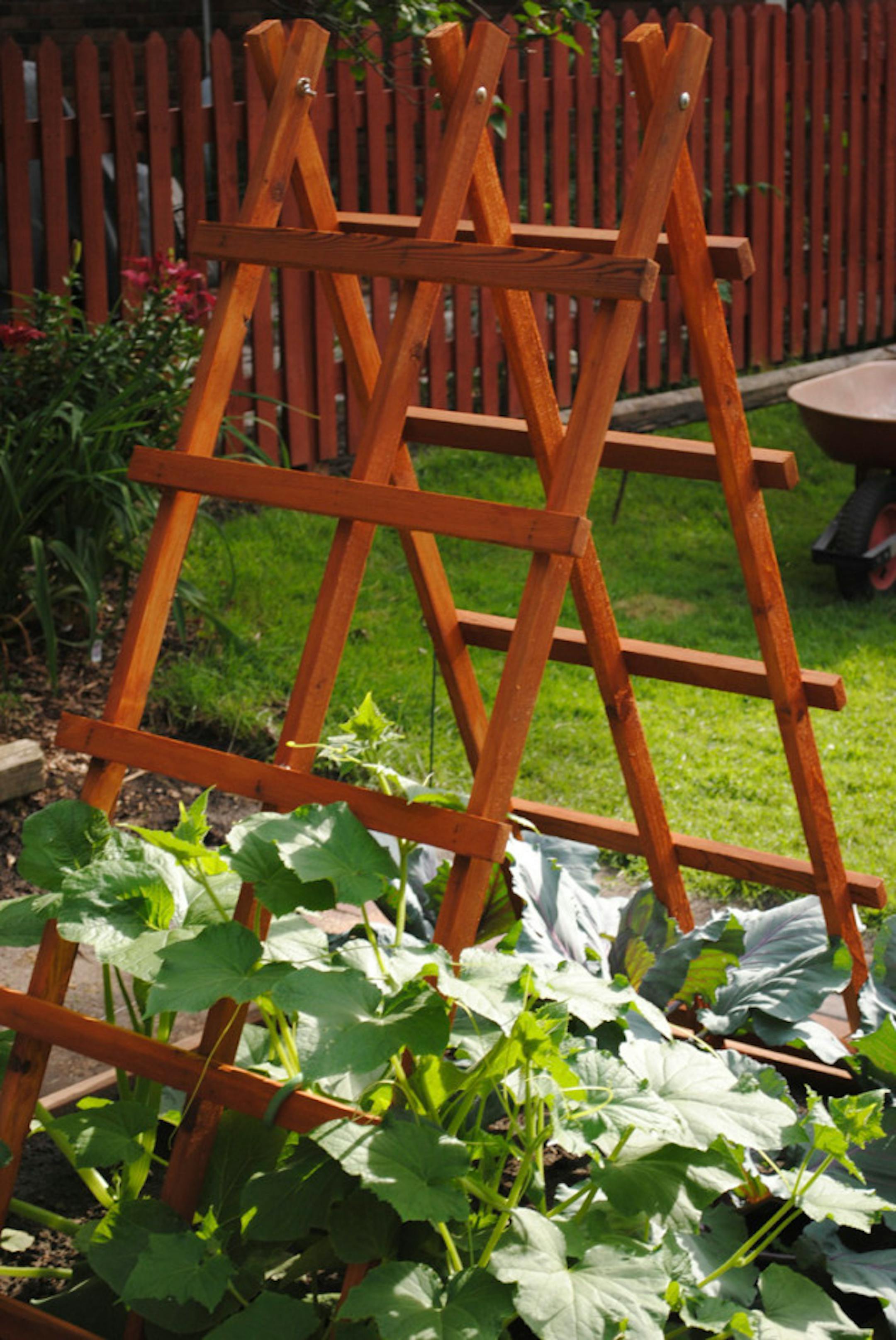 Last year's attempt sent me back to the drawing board, because my makeshift supports for vining plants were quickly overwhelmed, and first slumped and later toppled. I still got lots of produce, but it was dead annoying to lift up prickly cucumber vines to get at the cherry tomatoes on the plant at the bottom of the heap, and I'm sure the tomato wasn't so happy with the arrangement either. This year I invested in a sturdy A-frame trellis that I'm hoping can handle its weight in cucumbers.