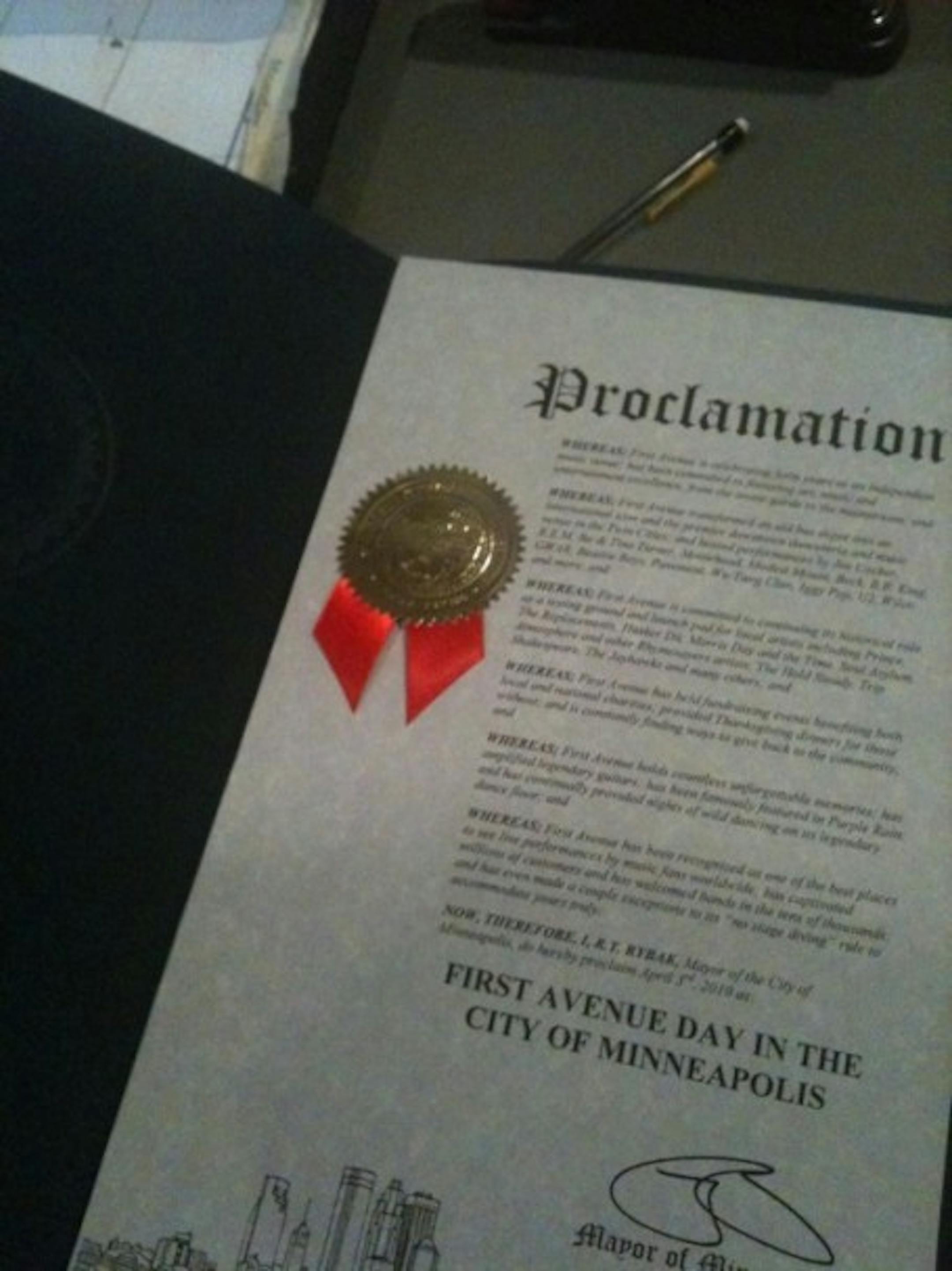 WHEREAS; First Avenue is celebrating 40 years as an independent music venue; has been committed to fostering art, music and entertainment excellence, from the avant-garde to the mainstream; and WHEREAS; First Avenue transformed an old bus depot into an international icon and the premier downtown danceteria and music venue in the Twin Cities; and hosted performances by Joe Cocker, R.E.M, Ike & Tina Turner, Motörhead, Modest Mouse, Beck, B.B. King, GWAR, Beastie Boys, Pavement, Wu-Tang Clan, Iggy Pop, U2, Wilco and more; and WHEREAS; First Avenue is committed to continuing its historical role as a testing ground and launch pad for local artists including Prince, The Replacements, Hüsker Dü, Morris Day and the Time, Soul Asylum, Atmosphere and other Rhymesayers artists, The Hold Steady, Trip Shakespeare, The Jayhawks and many others; and WHEREAS; First Avenue has held fundraising events benefiting both local and national charities; provided Thanksgiving dinners for those without; and is constantly finding ways to give back to the community; and WHEREAS; First Avenue holds countless unforgettable memories; has amplified legendary guitars; has been famously featured in Purple Rain; and has continually provided nights of wild dancing on its legendary dance floor; and WHEREAS; First Avenue has been recognized as one of the best places to see live performances by music fans worldwide; has captivated millions of customers and has welcomed bands in the tens of thousands; and has even made a couple exceptions to its "no stage diving" rule to accommodate yours truly. Now, therefore, I, R.T. Rybak, Mayor of the City of Minneapolis, do hereby proclaim Saturday, April 3rd, 2010 to be FIRST AVENUE DAY