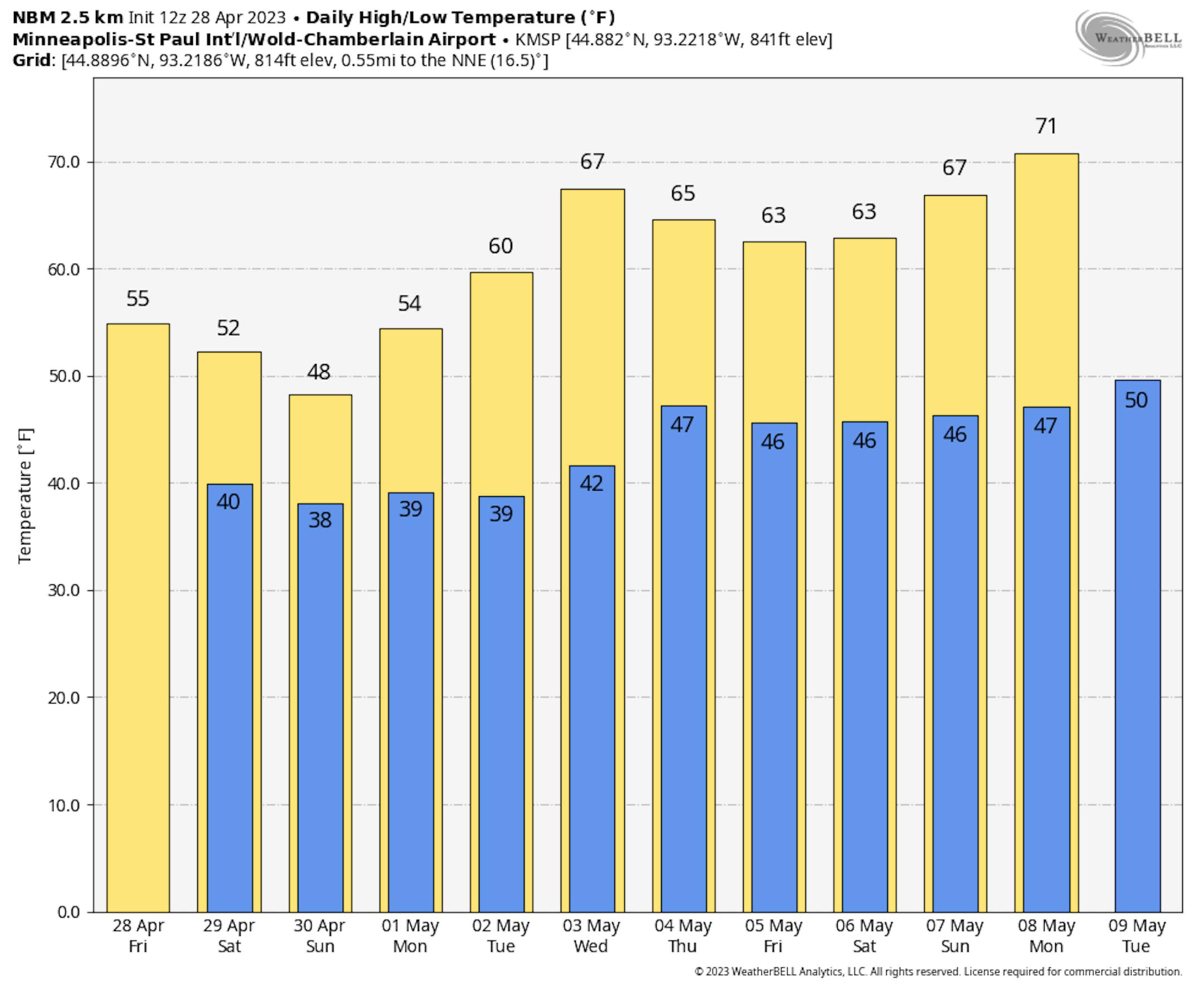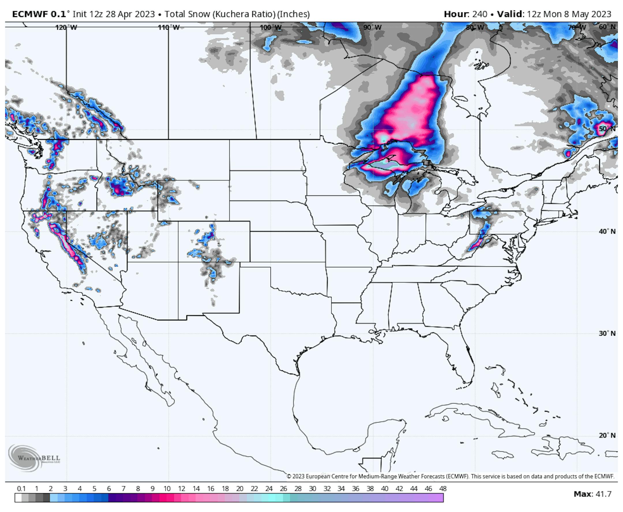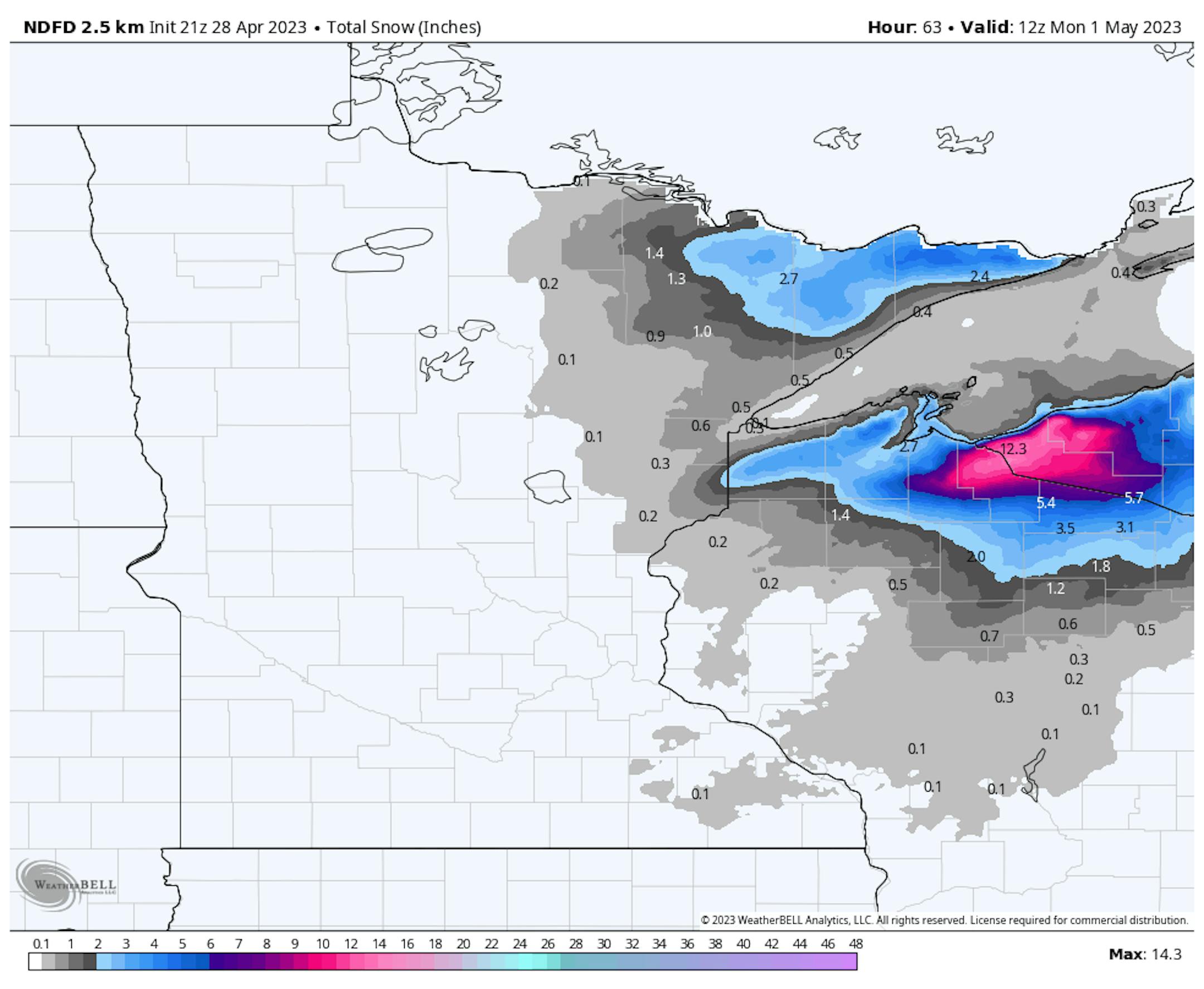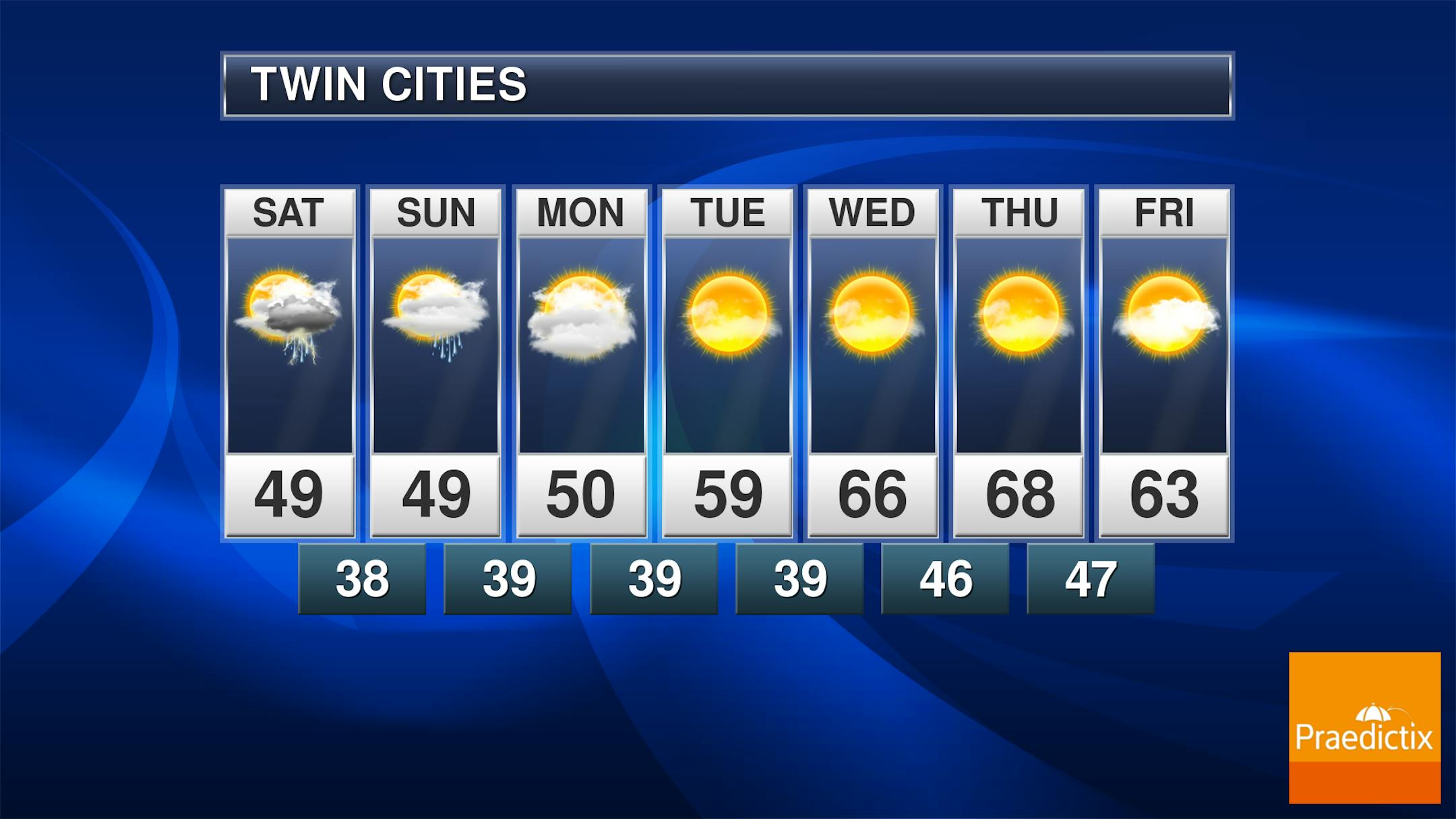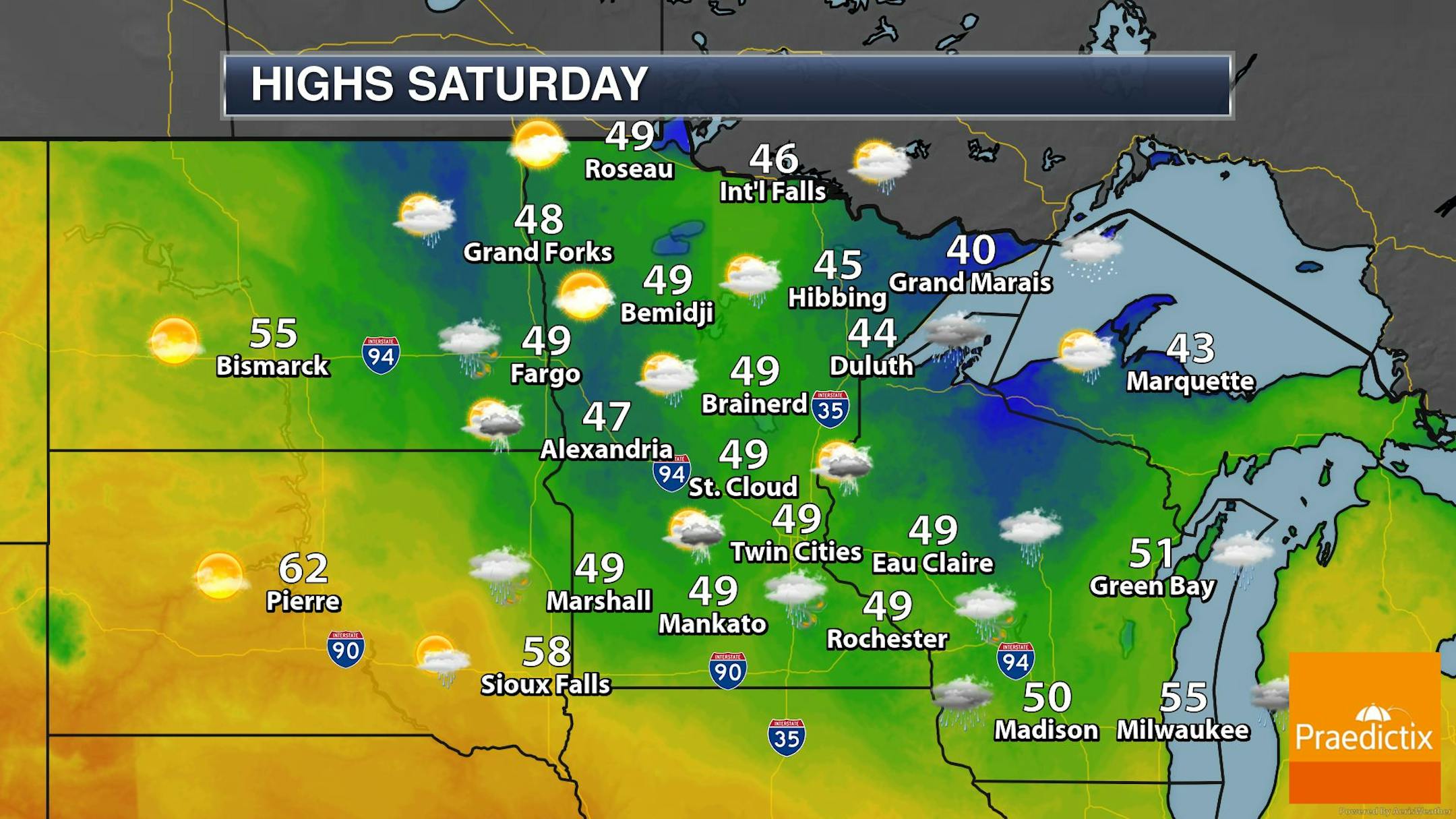 An intense area of low pressure will swirl around the Great Lakes this weekend sending waves of showers through Minnesota and Wisconsin. The heaviest precipitation will set up through Wisconsin and into the UP of Michigan with areas of snowfall possible there. There will also be some snow chances across the Arrowhead of Minnesota this weekend as well. For the Twin Cities, total precipitation amounts will overall be light, but cool, gray and showery conditions won't be favorable for many with outdoor plans.