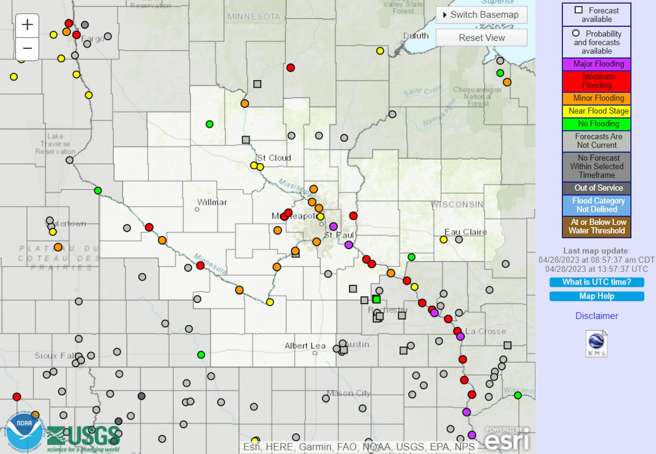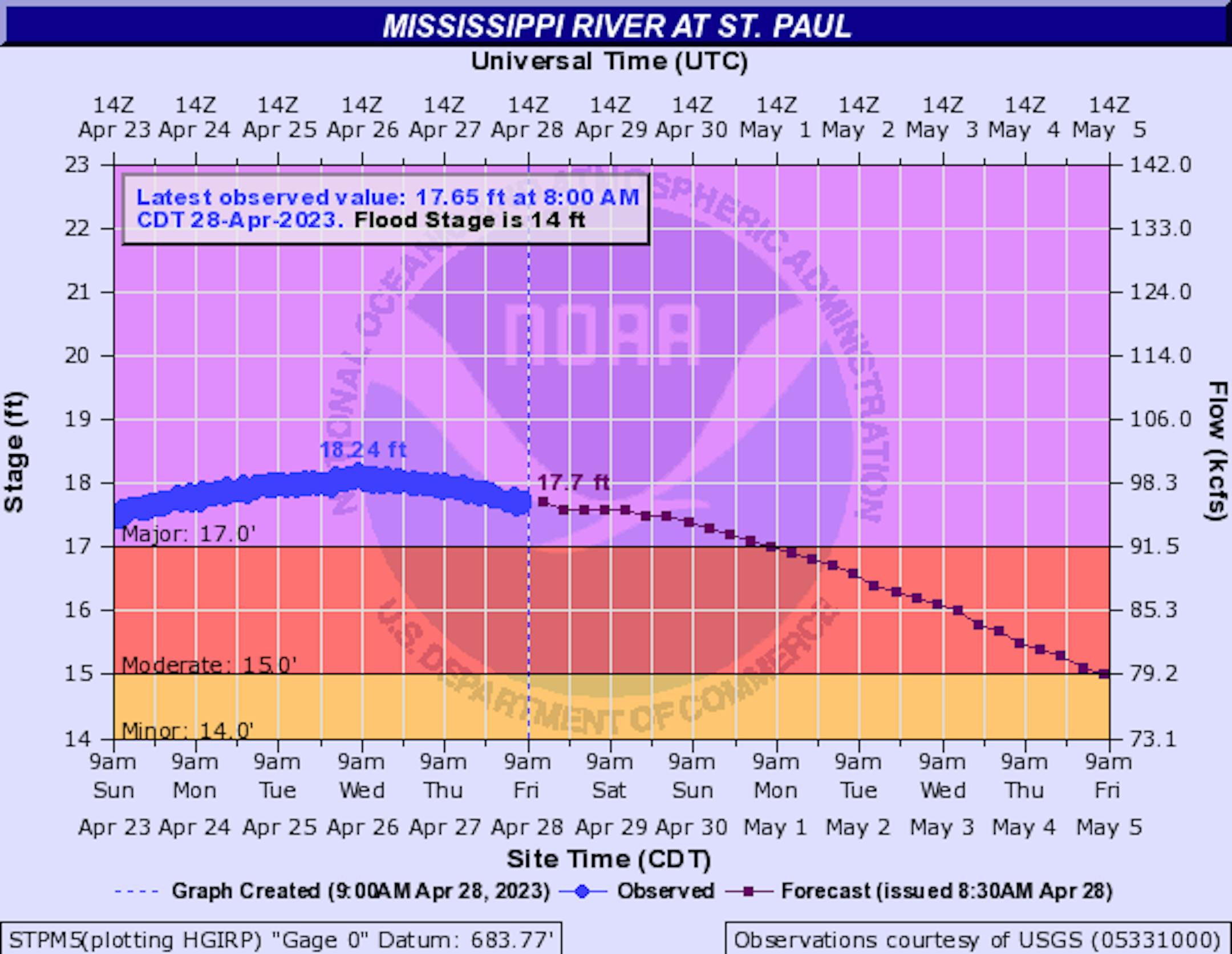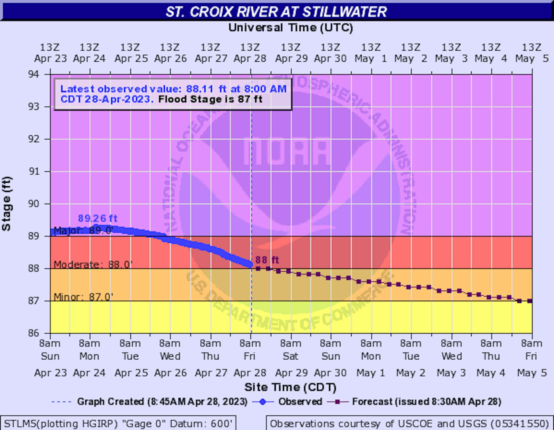 Here's the river forecast for the St. Croix River at Stillwater. Major flooding has ended after reaching a crest of 89.26ft earlier this week, which is the 7th highest crest on record there. We'll still be dealing with minor flooding through the weekend and most of next week, but the worst appears to be over for this spring.