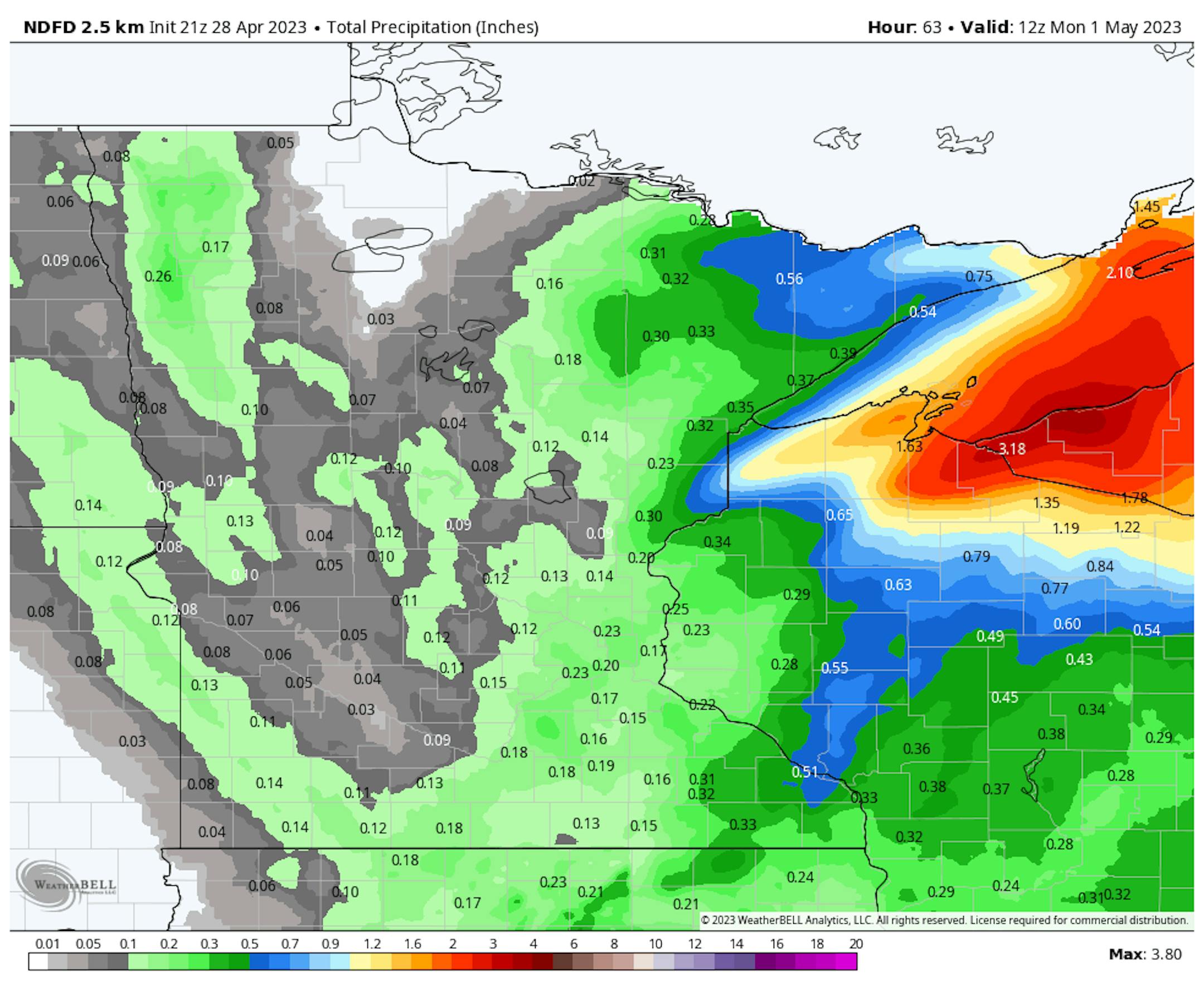 Here's the total liquid precipitation potential through AM Monday. Note that the heaviest amounts will be across northern Wisconsin, the UP of Michigan and the Arrowhead of Minnesota. Meanwhile, the Twin Cities could pick up and additional couple of tenths of an inch of liquid through the weekend.