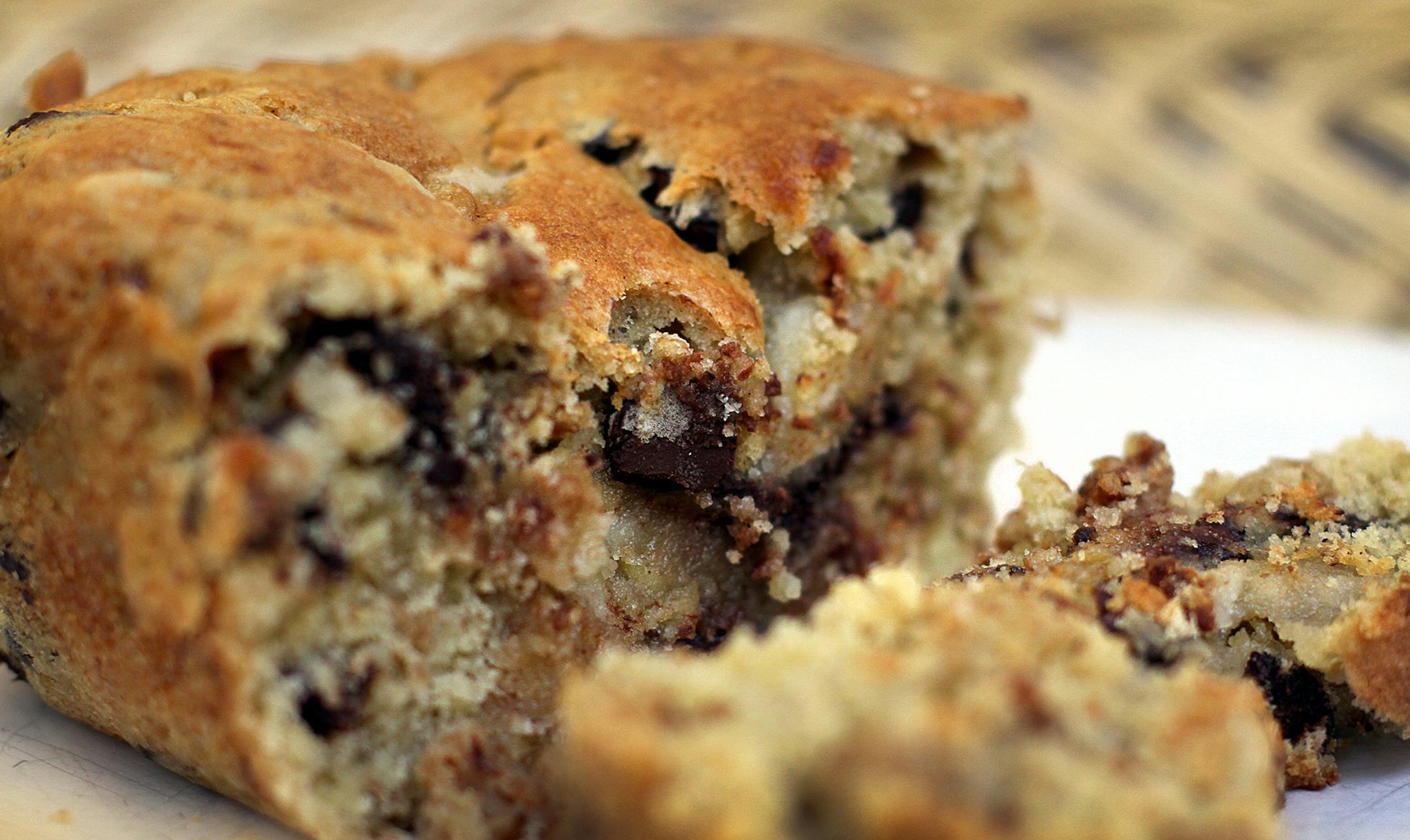In a separate medium bowl, combine the flour, baking powder, salt and cinnamon. Chop or tear the marzipan into small pieces and add to the flour mixture, stirring to coat each piece with flour and prevent the marzipan pieces from sticking together. Stir in the chocolate chips if you're using them. Add the flour mixture to the butter mixture and stir just until combined.