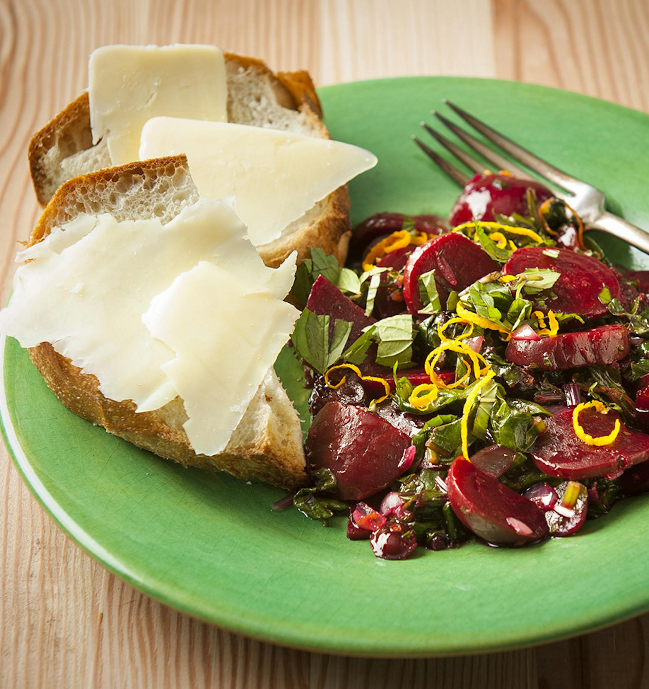 Preheat oven to 350 degrees. Cut the beet greens from the beets, leaving a 1/2-inch plug of stem. Rinse the greens under cold running water and set aside to drain. Scrub the beets and roast whole, unpeeled, on a baking sheet until you can insert a skewer or thin-bladed knife through the center, about 45 minutes to 1 hour, depending on size. Remove and allow the beets to cool, then peel and cut into slices 2 inches thick.