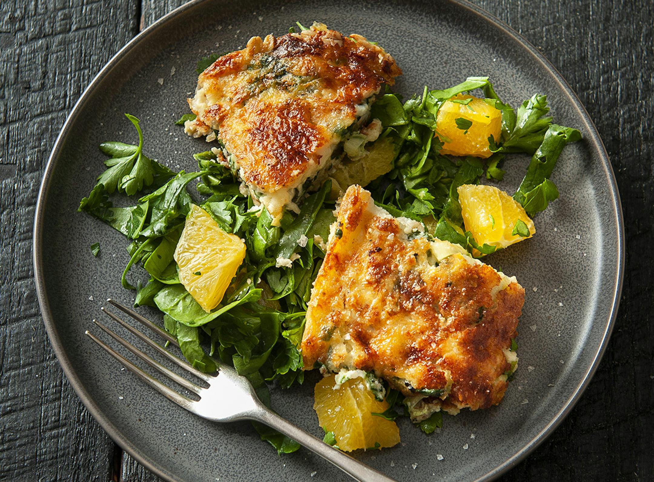 Spinach: Add 1 pound chopped fresh spinach to the pan with the onions. (You can skip this step by using 1 cup frozen spinach, thawed and thoroughly drained, no need to sauté.) Stir the spinach into the egg and cheese mixture and continue with the recipe. Serve slices of this quiche on a bed of fresh spinach and orange sections (as shown in the photo).