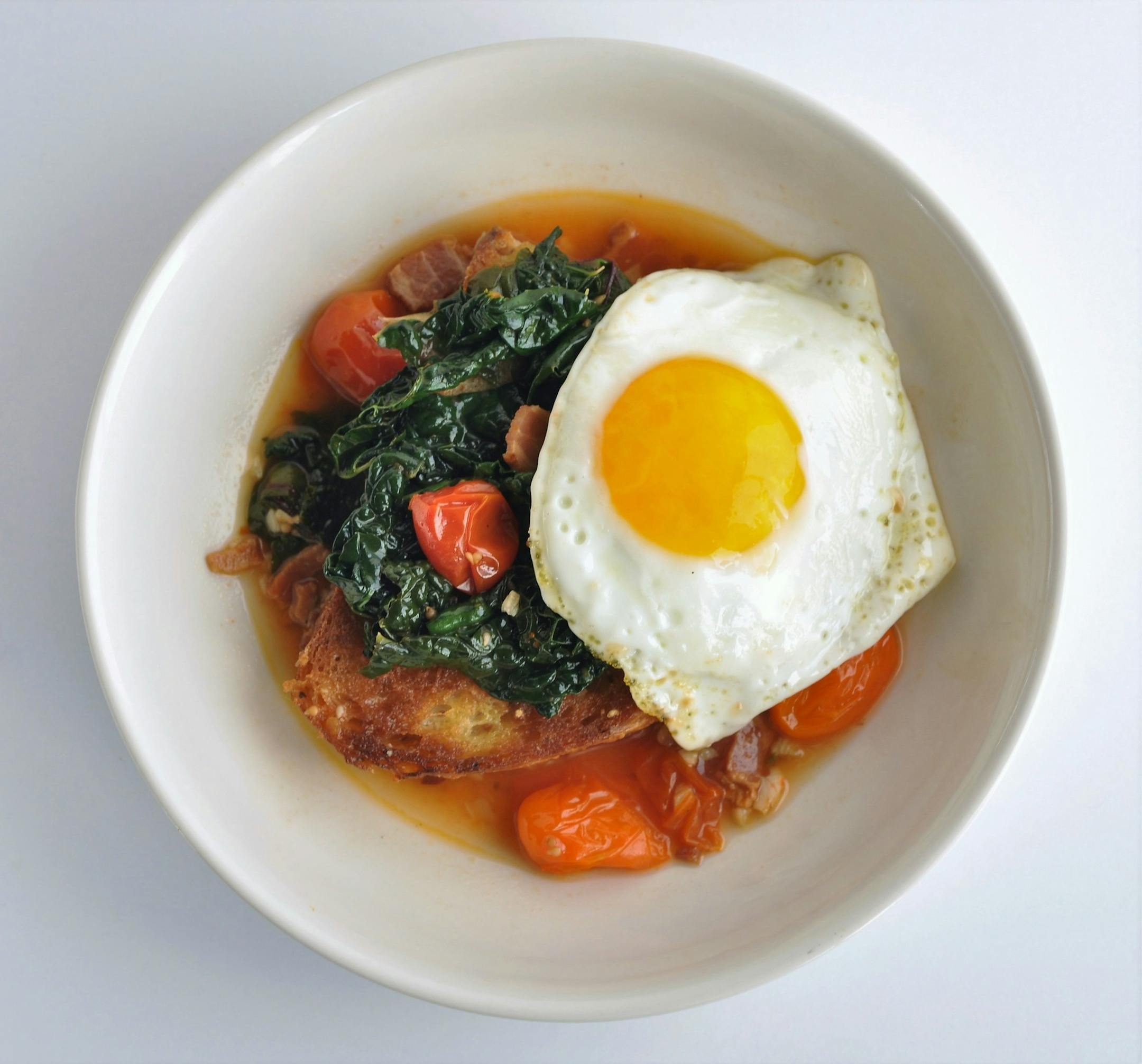 Fried Bread With Greens, Eggs and Smoky Tomato Broth