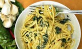 While the pasta is cooking, transfer the greens to a colander and rinse under cold running water, then drain well.