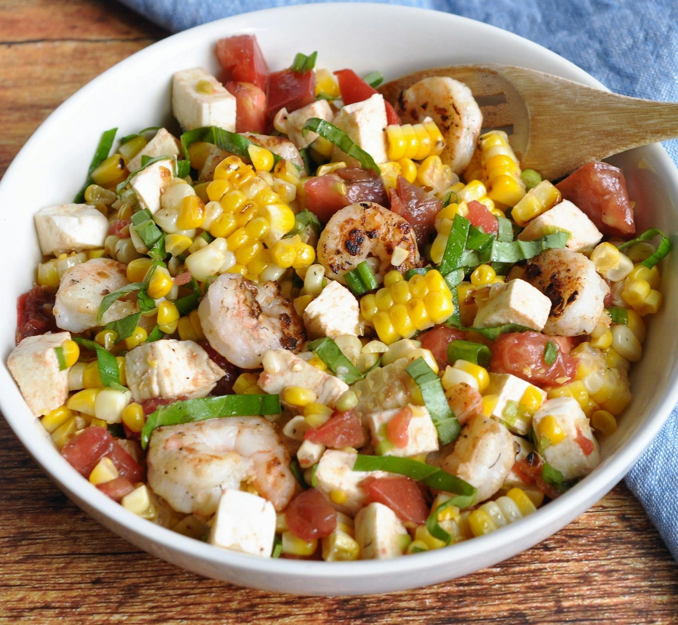 Remove the shrimp from the skewers and add to the bowl with corn, drained tomatoes, green onions, mozzarella and basil and remaining dressing. Season to taste with salt, pepper, and more balsamic vinegar, if desired.