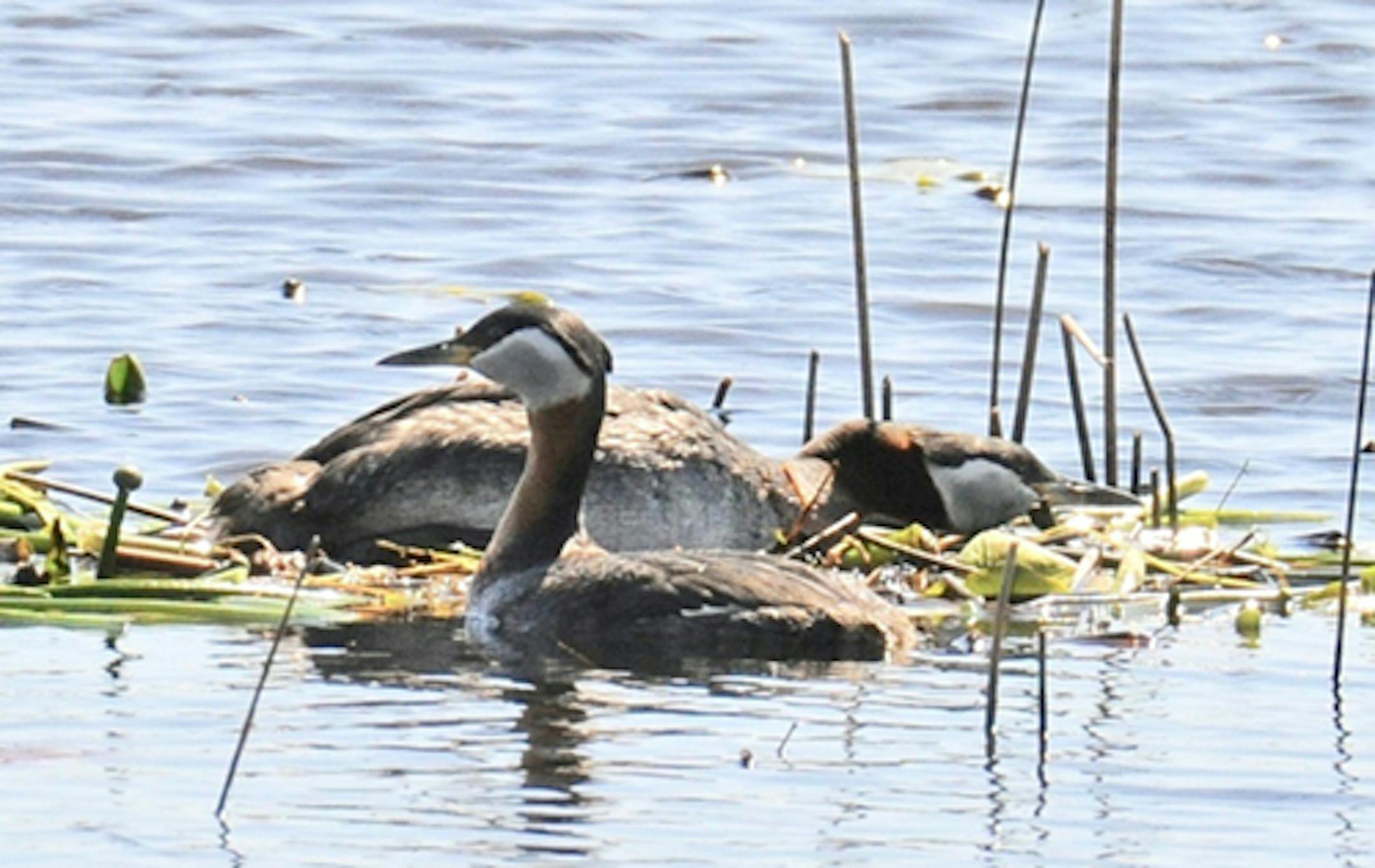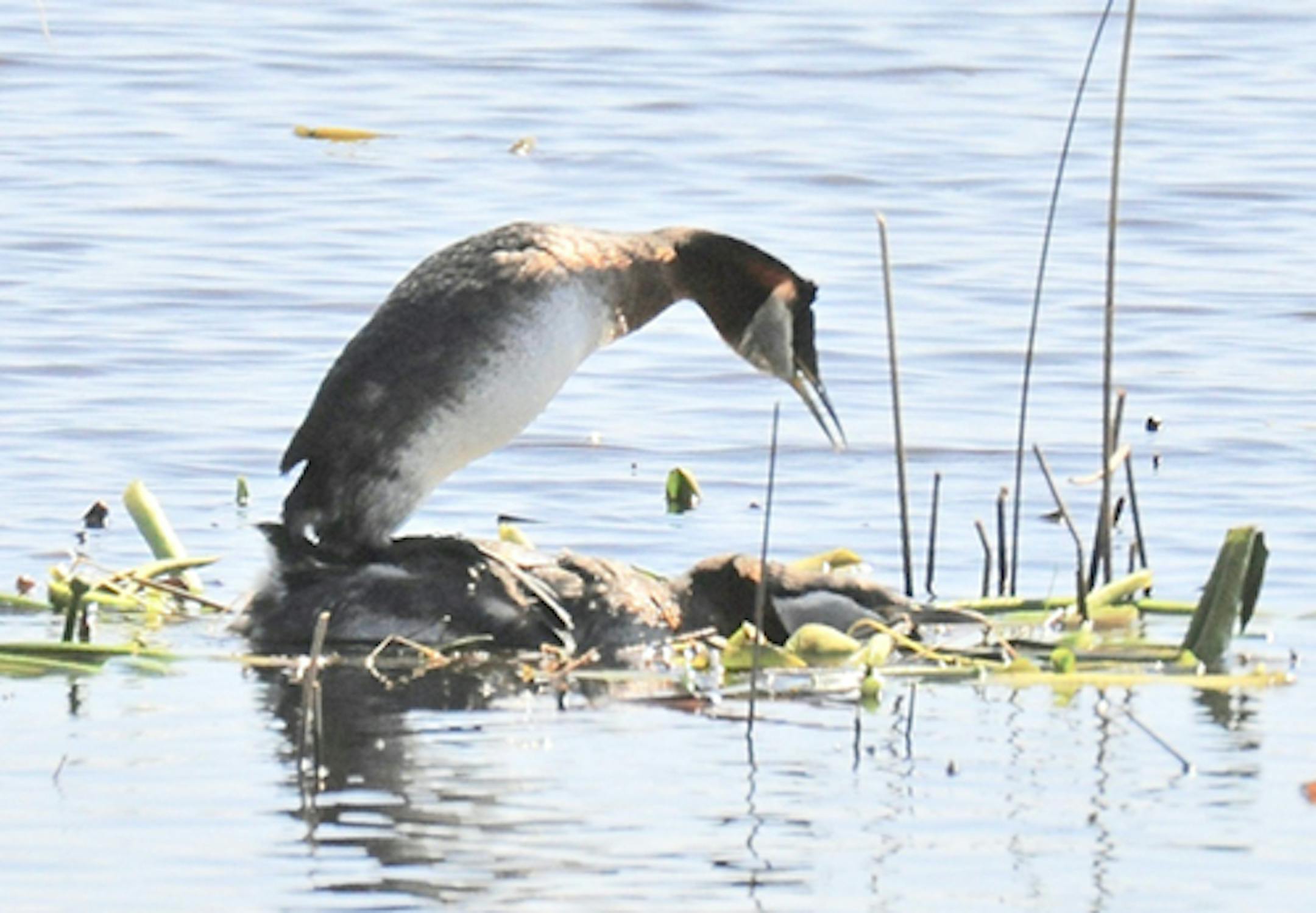 I have read that this grebe species sometimes builds one nest for mating, another for eggs and incubation. I'm hope that is not the case here. I plan to return to the lake, an open view of nesting and chicks probably too much to ask. We'll see.