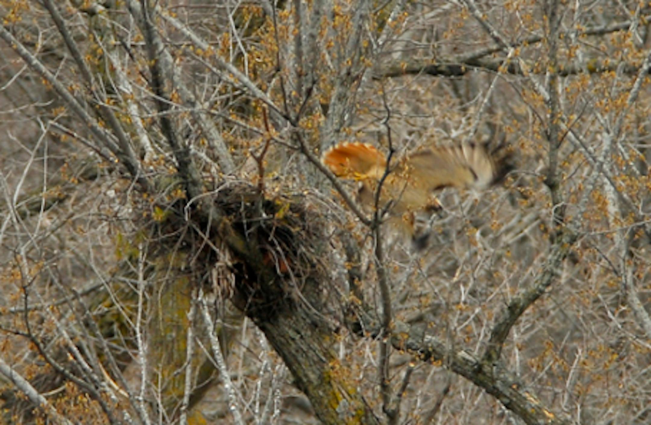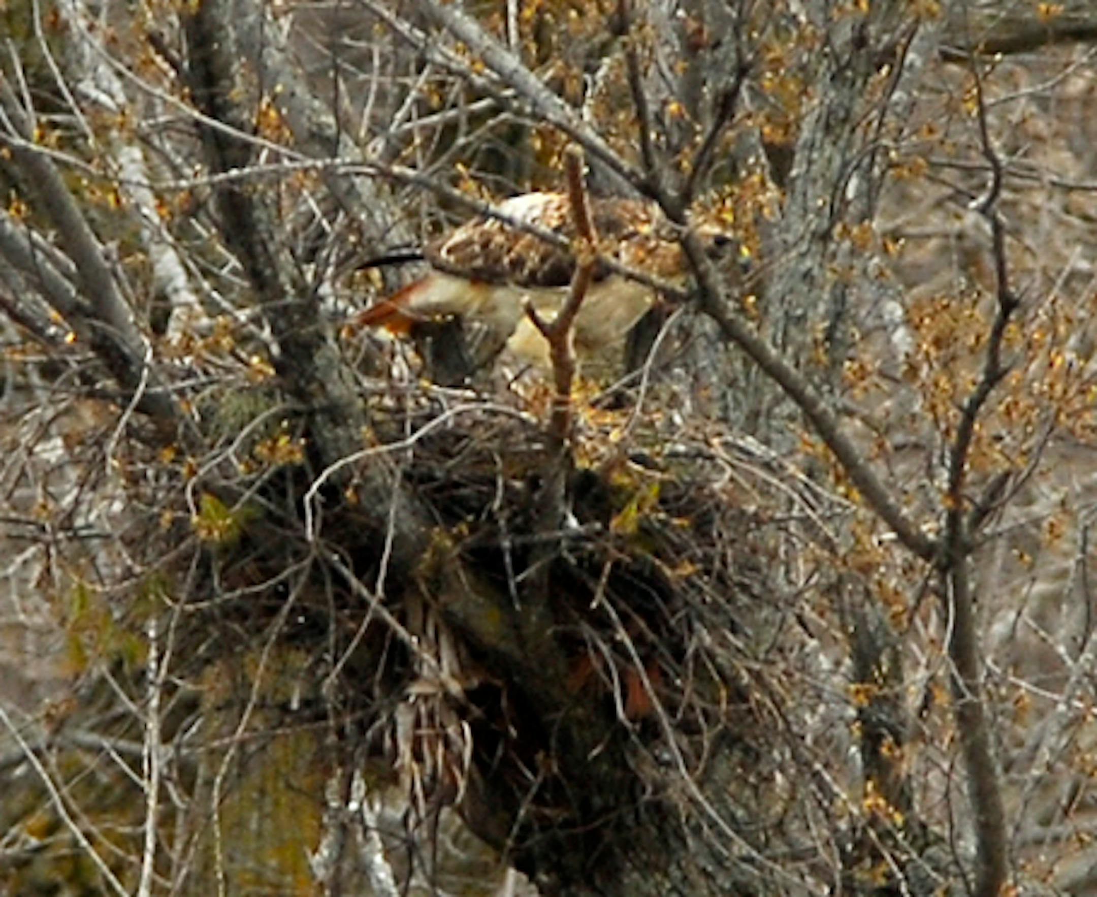 Here are a couple of photos taken this morning of a pair of Red-tailed Hawks that are nesting in our neighborhood. Both birds are in/on the nest in the first photo, although the bird on the eggs is not visible. The bird on the nest edge, and then seen leaving the nest, had come to the nest with a food item.