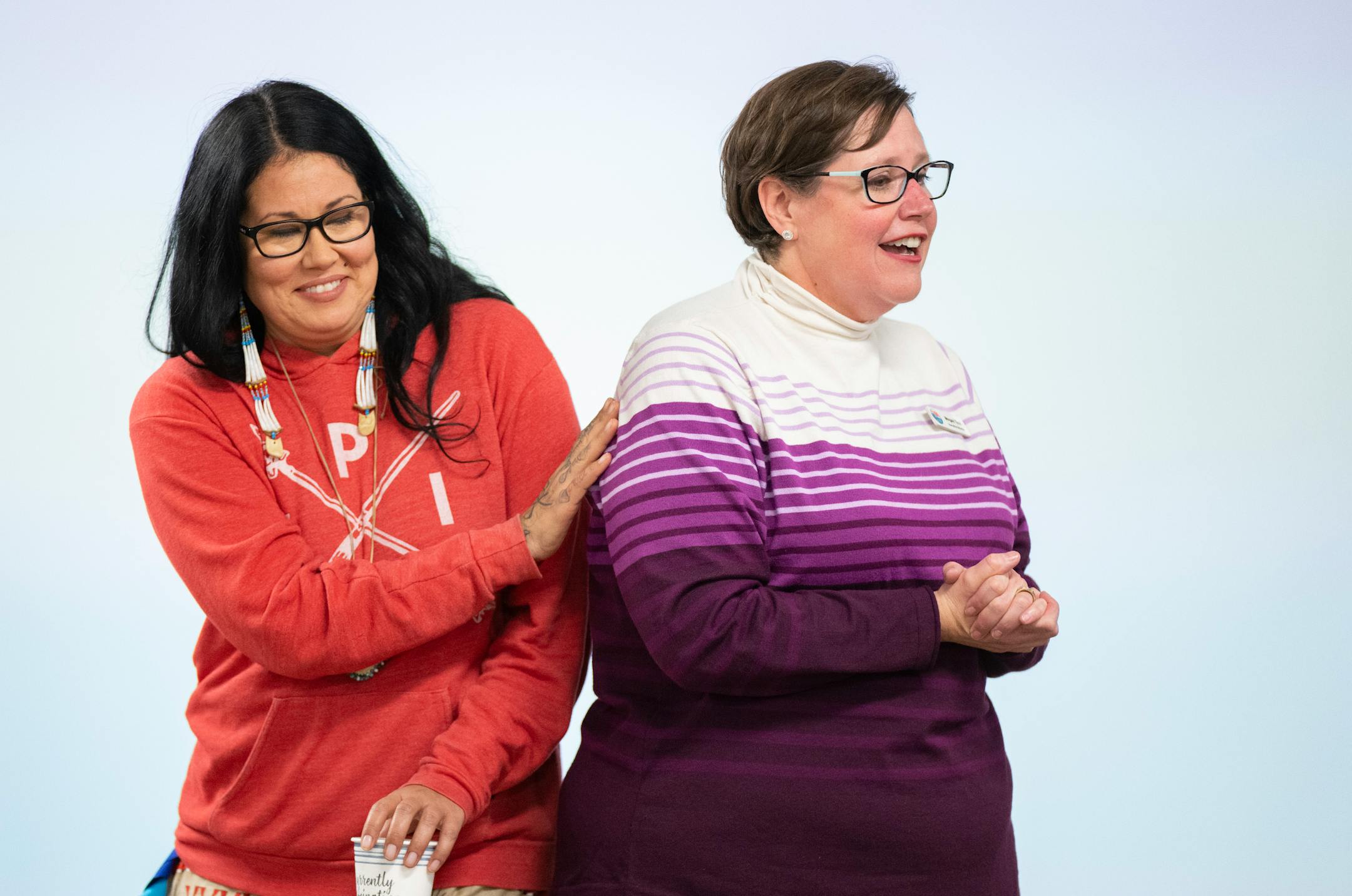 Nicky Buck, a Prairie Island Indian Community member, thanked Megan Tsui, executive director of Red Wing Downtown Main Sreet, for her introduction Wednesday at Red Wing Public Library in Red Wing. (Alex Kormann, Star Tribune/The Minnesota Star Tribune)