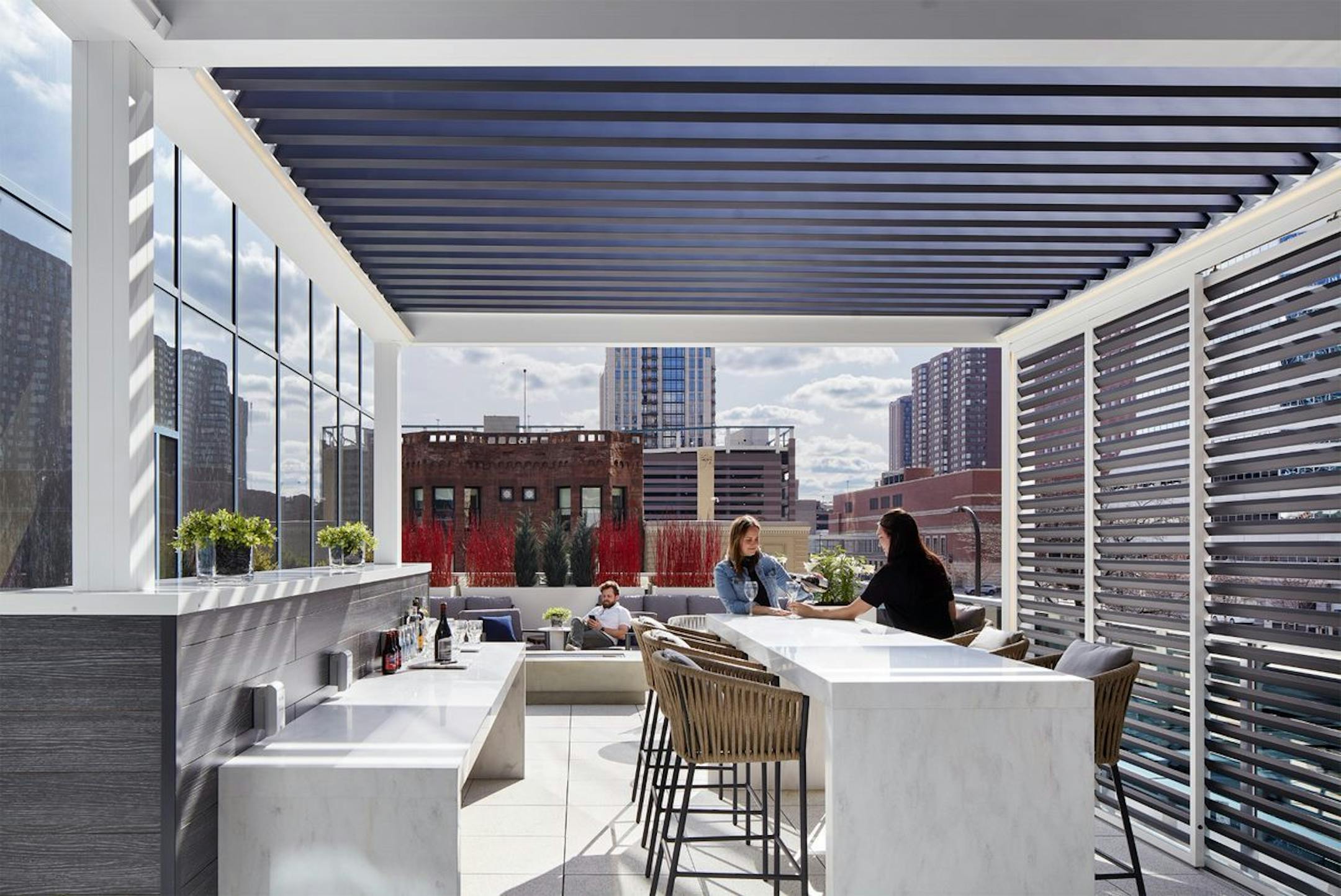 General contractor Gardner Builders plus the Nelson Worldwide design firm have since overhauled the Class A tower's elevator banks, lobby, atrium and skyway with sleek marble, high-technology and security features. They added indoor and outdoor rooftop terraces, video conference rooms and a pool table room and also renovated the first and second floors plus various tenant spaces.