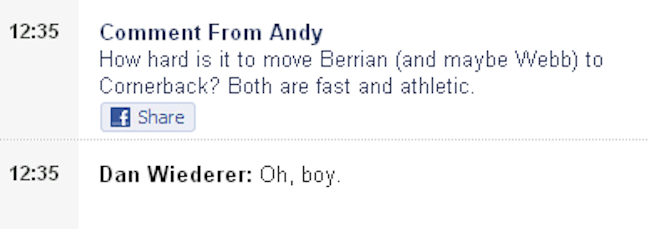 New Vikings beat writer Dan Wiederer just finished his first live chat with fans, which means he's getting a real taste for how we operate here in Minnesota. As you can see, one question he fielded concerned the possibility of moving Bernard Berrian and/or Joe Webb to cornerback.
