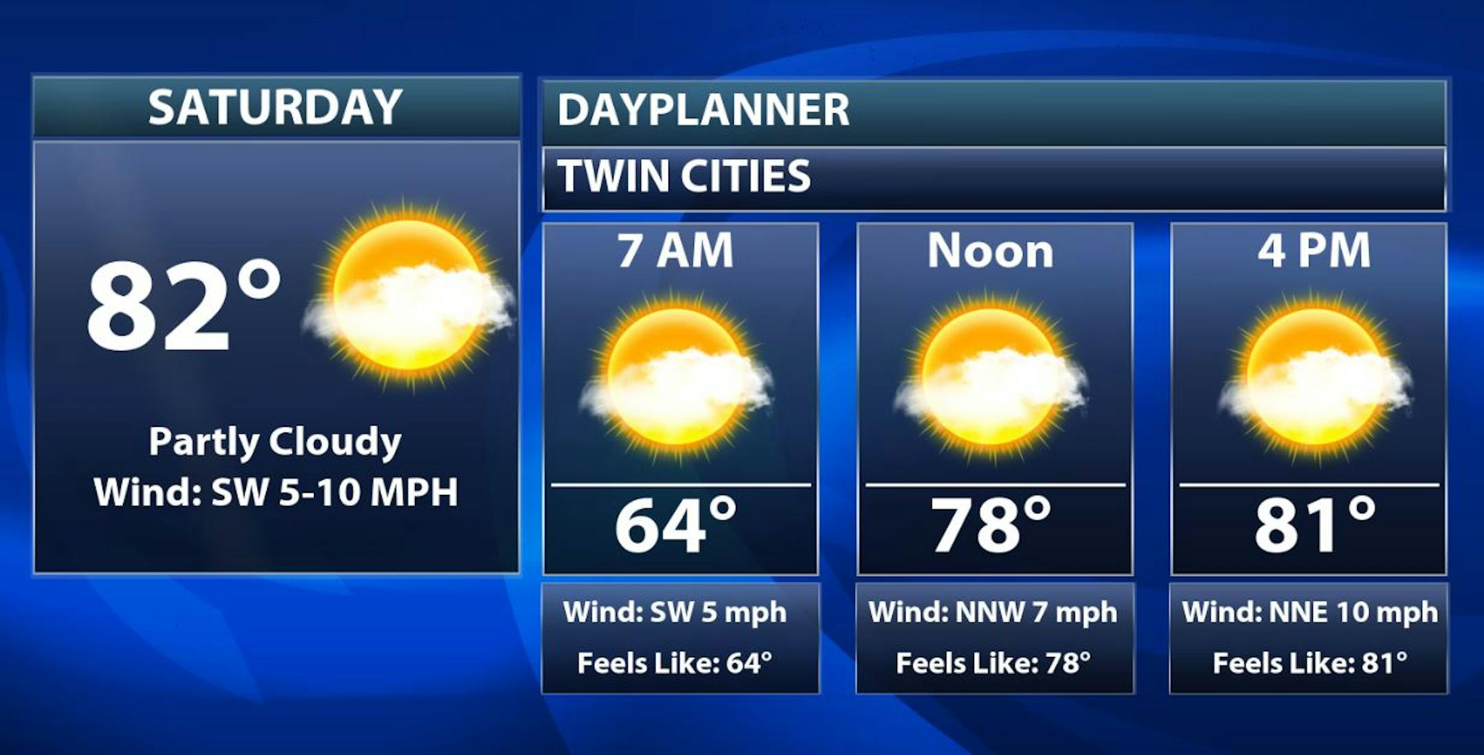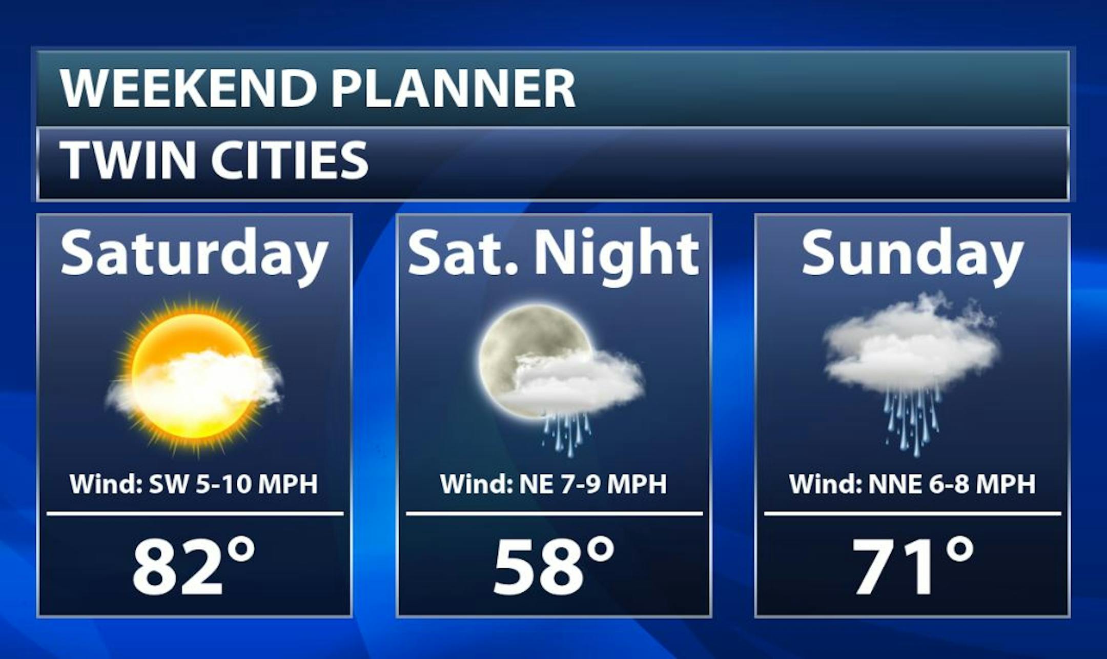 The weather outlook for the weekend in the Twin Cities doesn't appear to be all that bad. Most of the day Saturday will be dry and mild with temps warming into the lower 80s by the afternoon. However, it will be a bit smoky & hazy thanks to western wildfires. Isolated showers and perhaps a rumble of thunder arrives overnight Saturday and could linger into Sunday as a cool front sweeps through. Temps on Sunday will be nearly 10F cooler than Saturday.