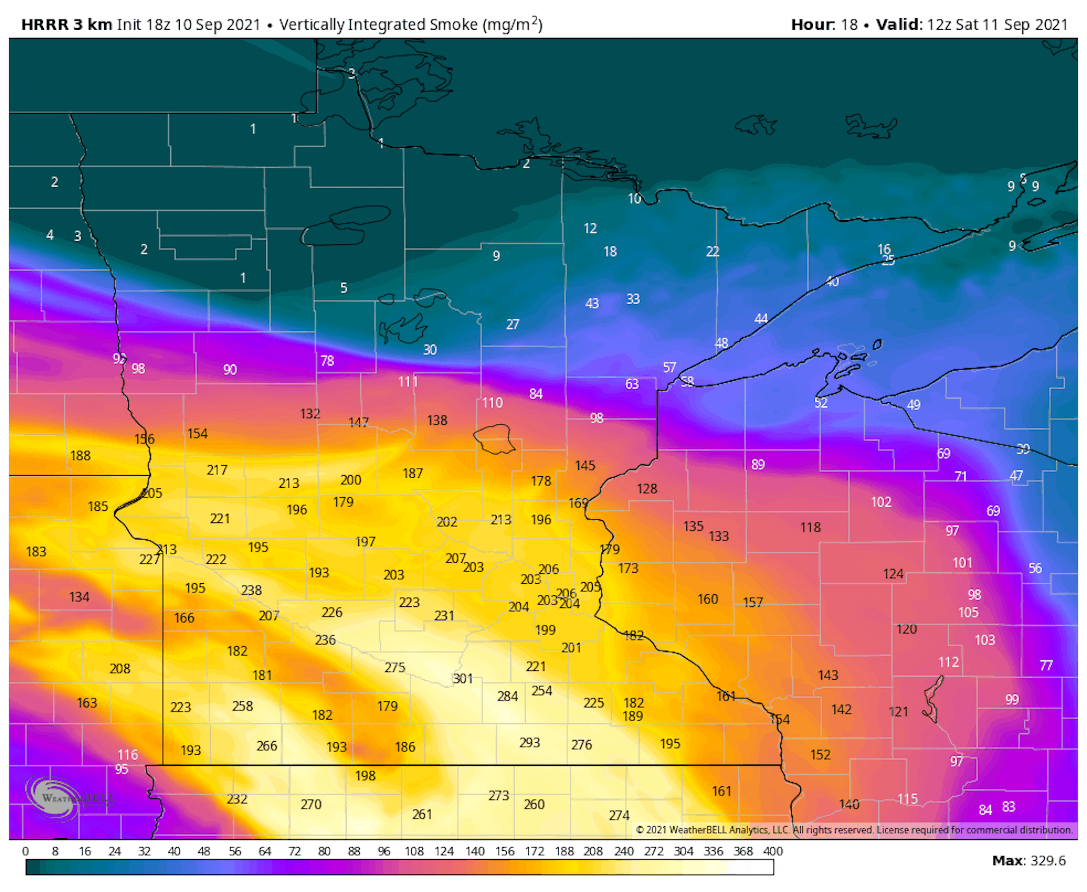 Here's the smoke analysis from AM Saturday to Midday Sunday, which shows fairly widespread smoke moving through the southern half of the state on Saturday. Skies will appear quite smoky & hazy much of the day Saturday, but will improve slightly on Sunday.