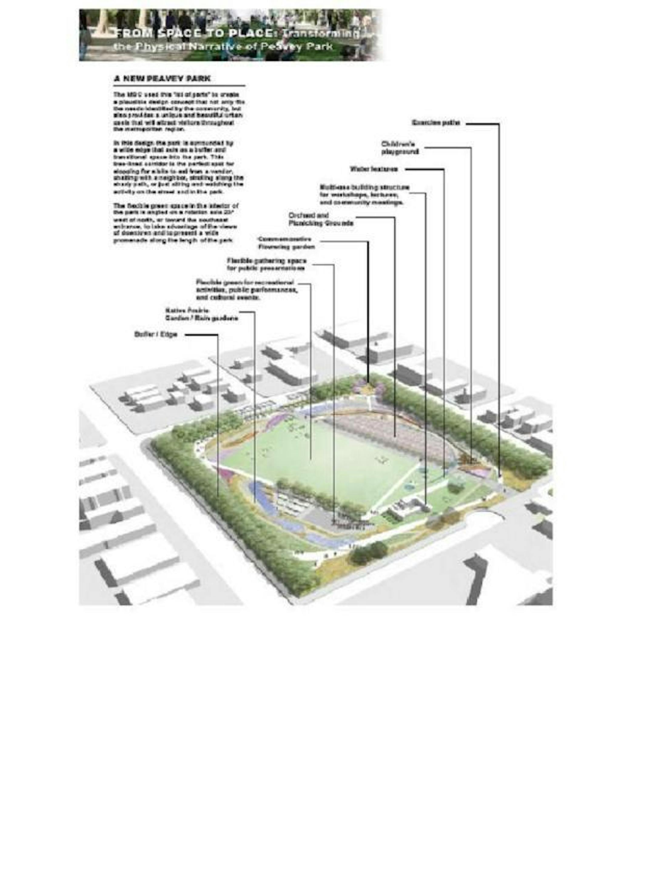 The design team used examples from parks in New York, Los Angeles and as far away as Galway, Ireland and Germany to show what's possible. Their vision, seen on page 30 of this document, might get funding in 2013 if it wins approvals, said Mary Watson, of the Ventura Village Neighborhood Association. Go to the Friends of Peavey Park site to see the plans, or scroll through the Scribd version posted below. (Vision of new park begins on page 30).