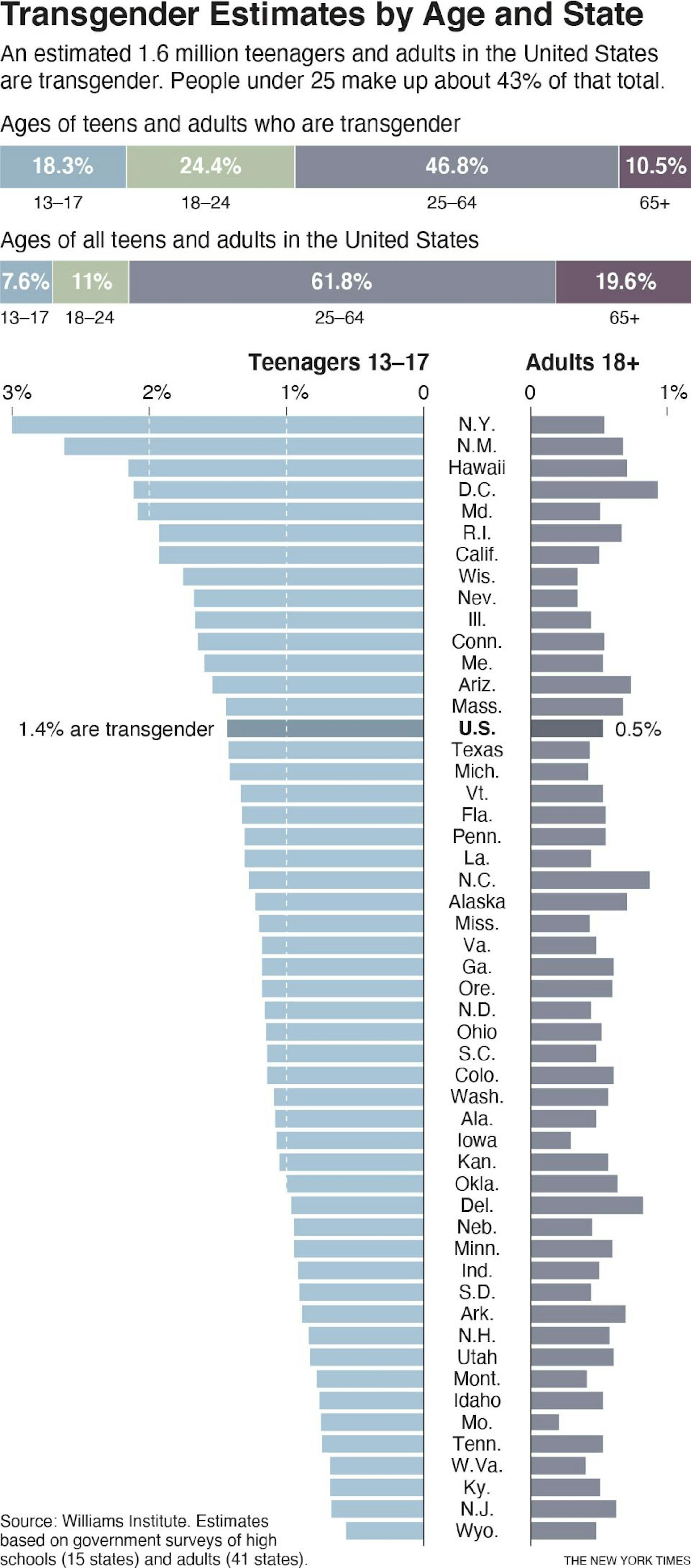 The analysis, relying on government health surveys conducted from 2017 to 2020, estimated that 1.4% of 13- to 17-year-olds and 1.3% of 18- to 24-year-olds were transgender, compared with about 0.5% of all adults.