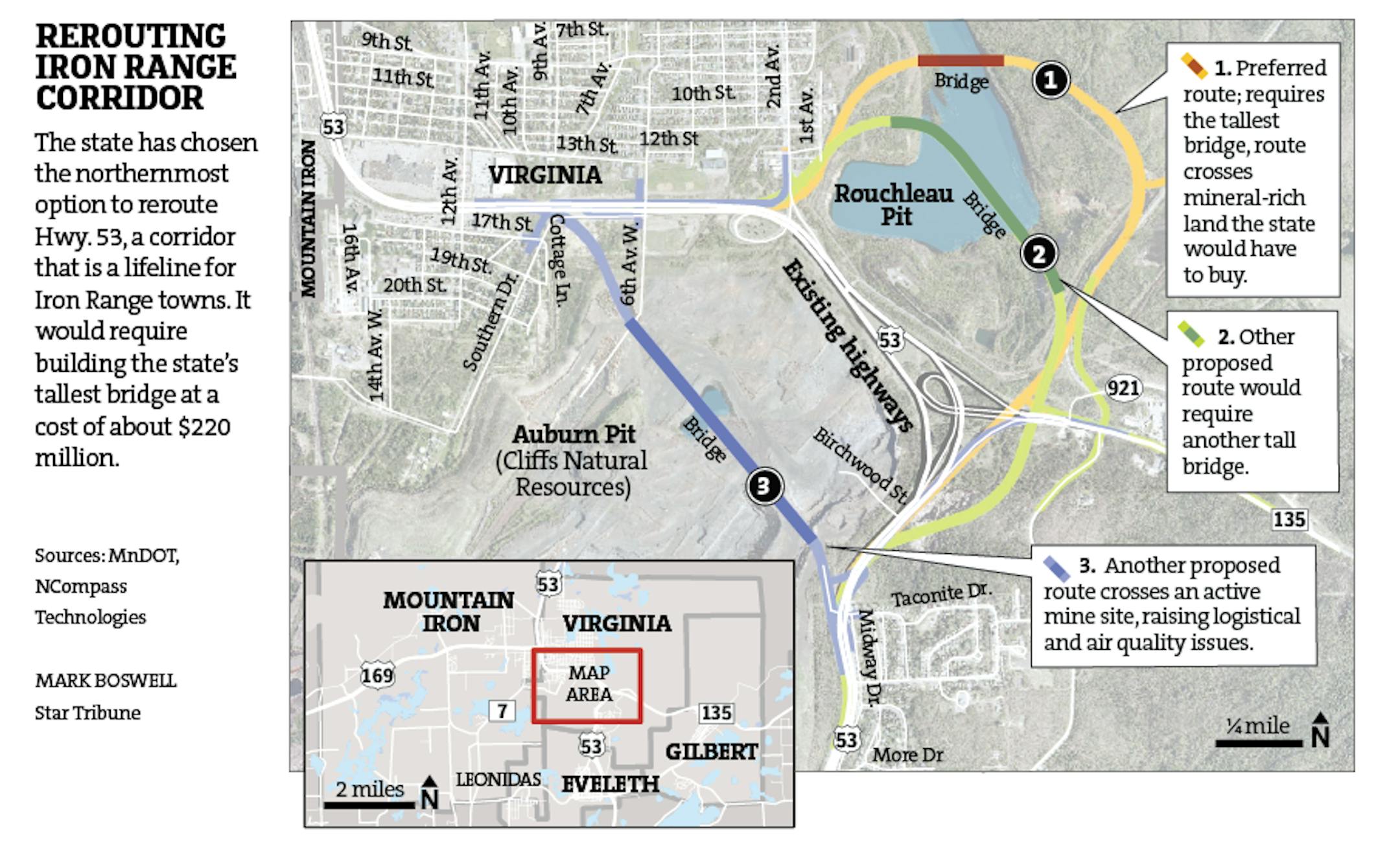 The state has chosen the northernmost option to reroute Hwy. 53, a corridor that is a lifeline for Iron Range towns. It would require building the state's tallest bridge at a cost of about $220 million. Here's a look at the routes and area.