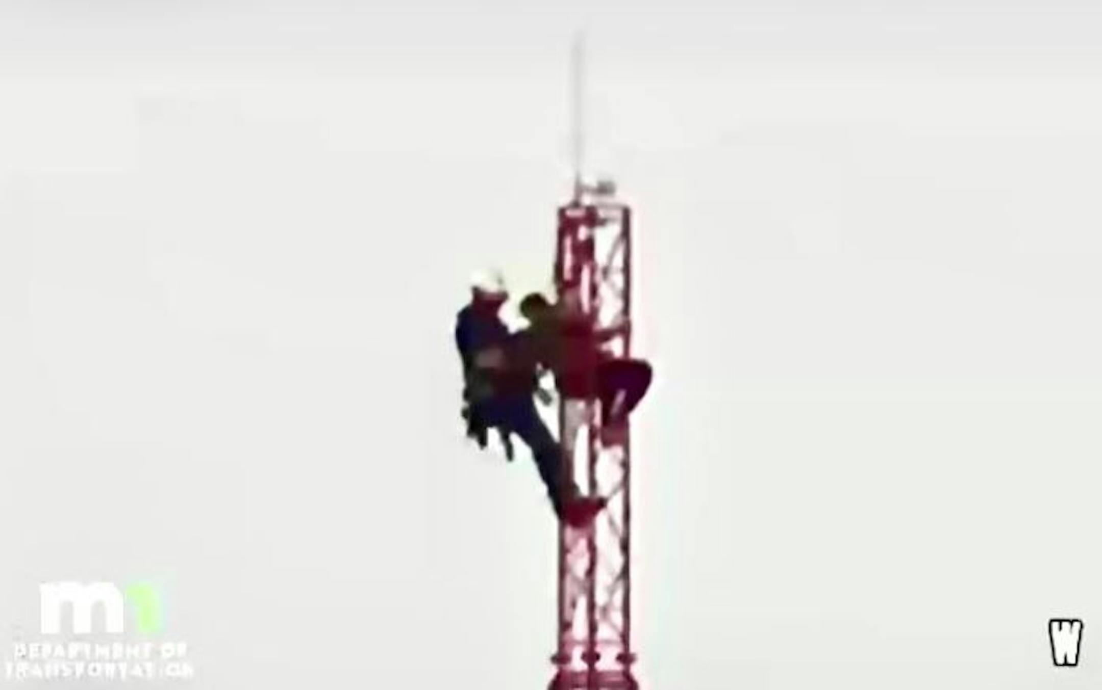 A member of the Dakota County Special Operations Team climbed to the top, attached himself to the man and had him back on the ground about 7:50 a.m., according to police.
