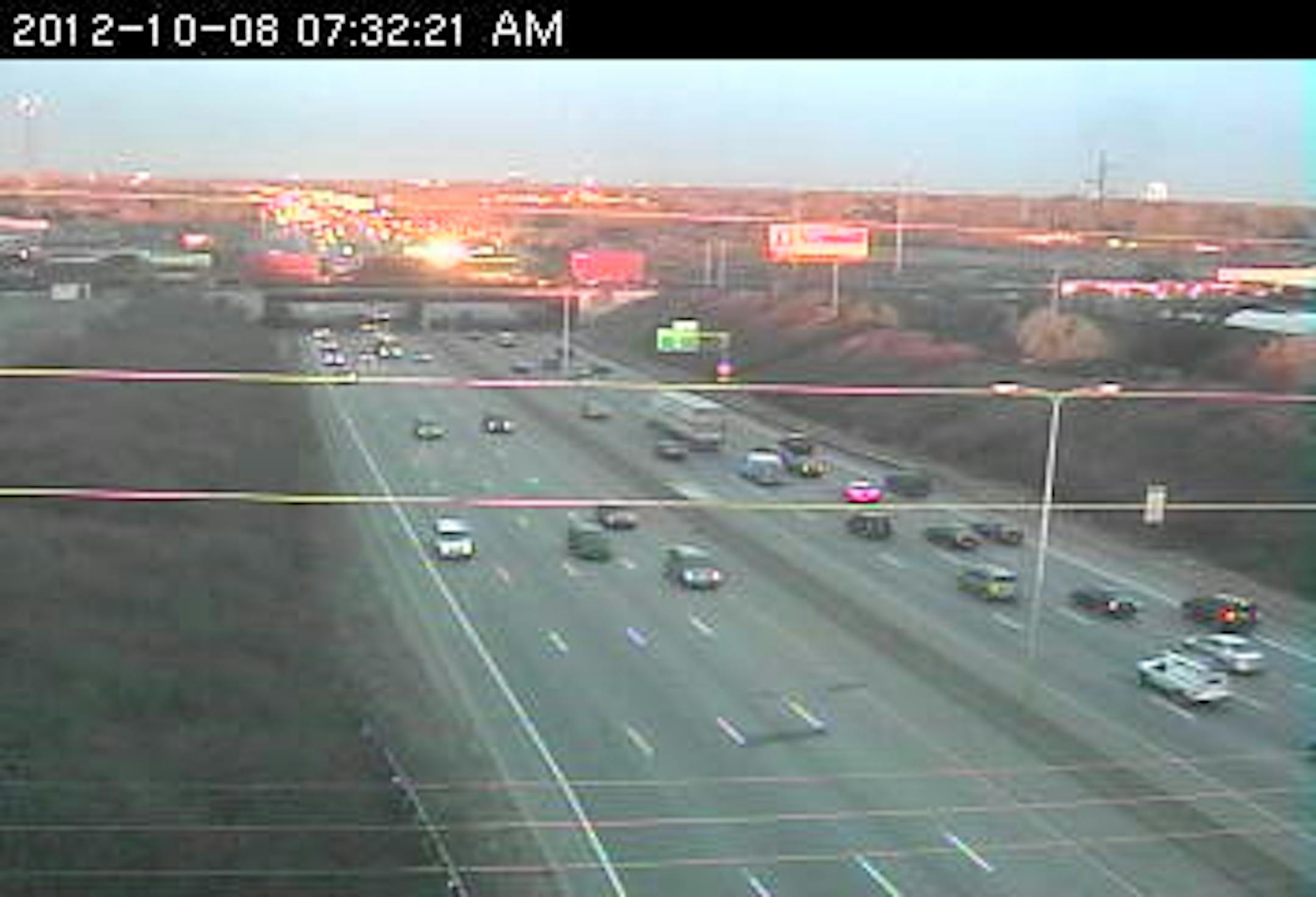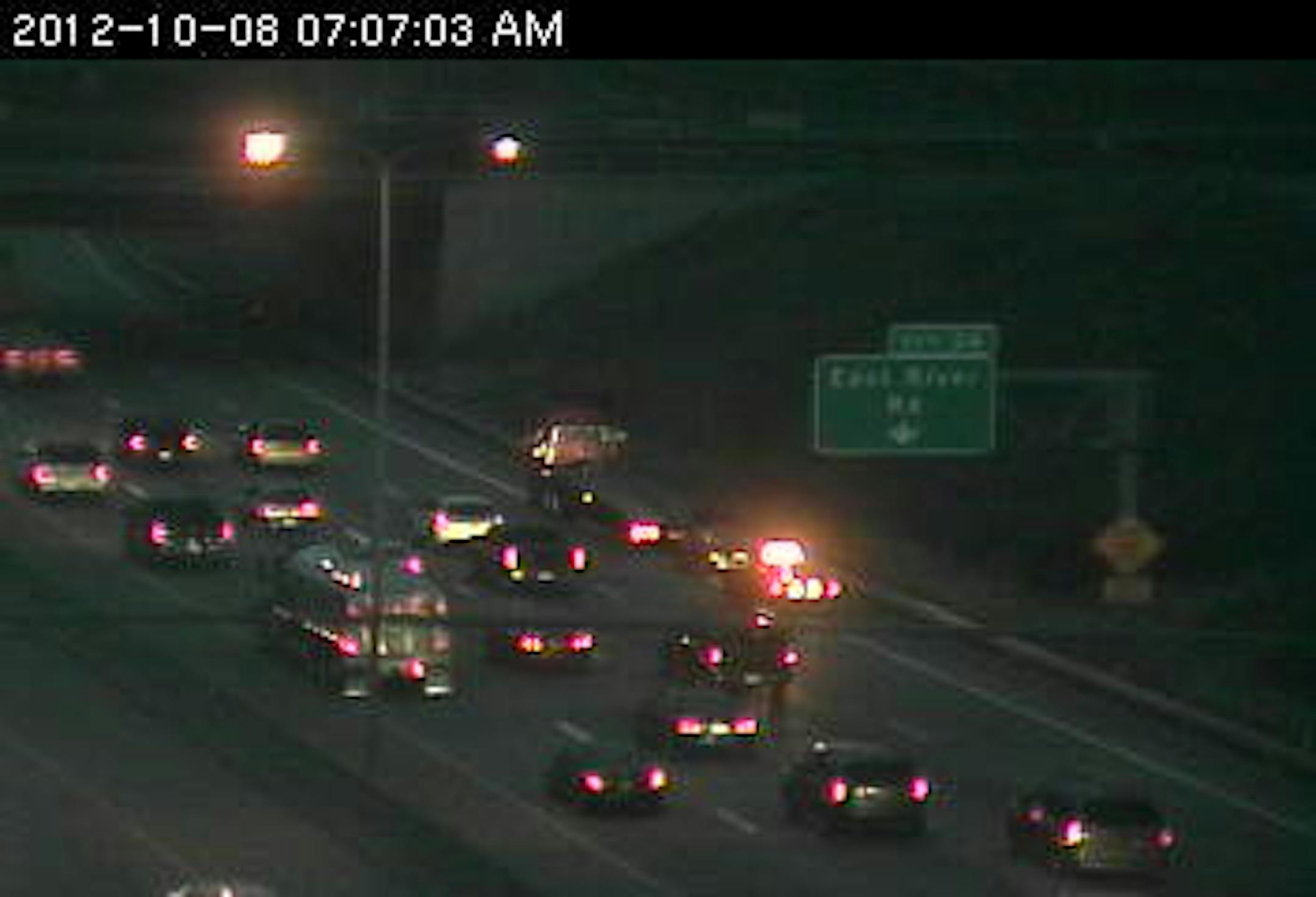 The right lane of westbound 694 is blocked at East River Road because of a two-vehicle crash.