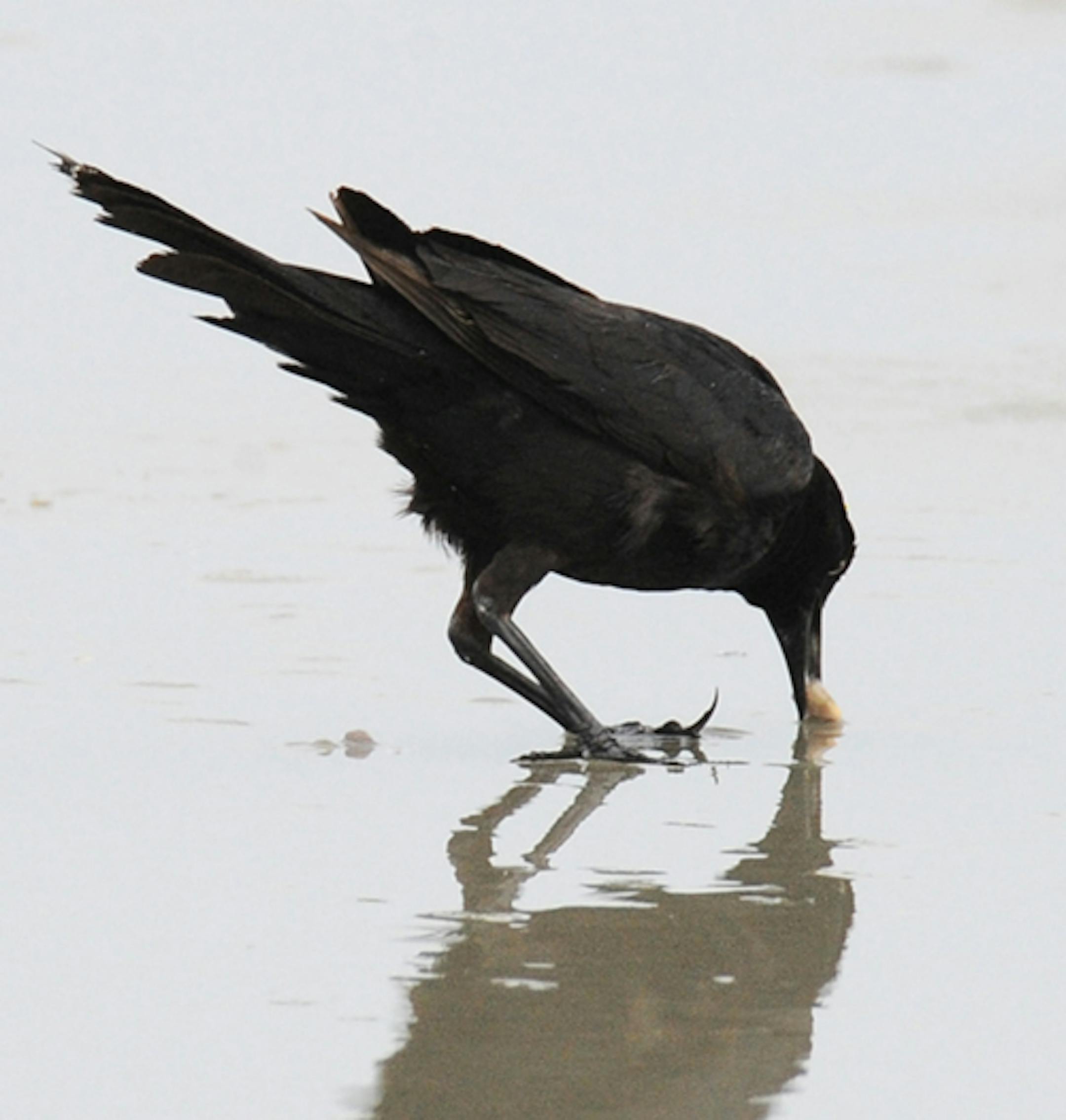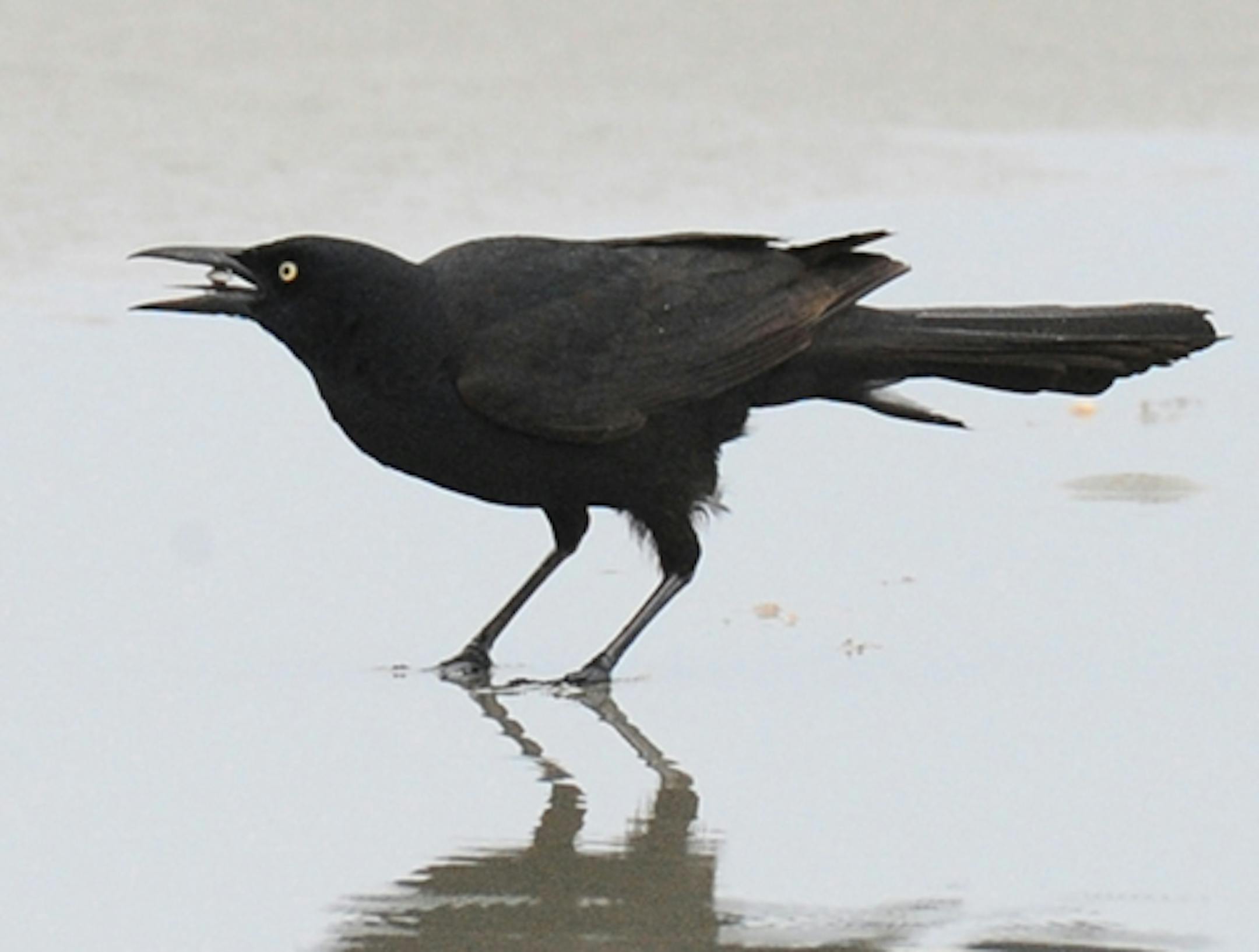 During a recent visit to South Carolina I watched Common Grackles feeding on tiny clams they dug at low tide from sand along an Atlantic beach. The birds walked, looking for holes the self-buried clams made in the sand for breathing purposes. A quick poke of the bill down the hole produced a clam. Several grackles were seen doing this.