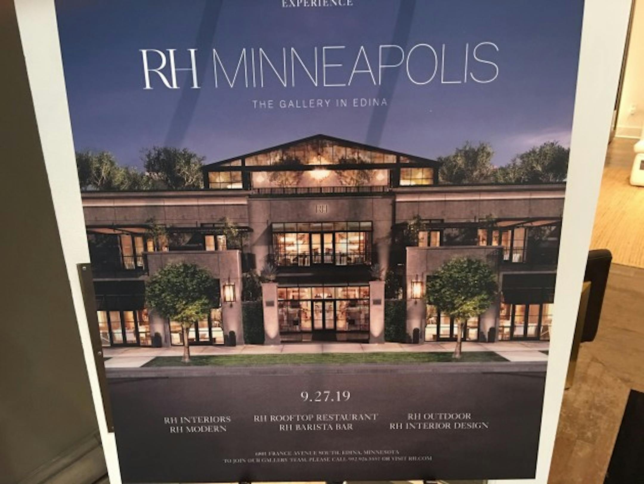 Restoration Hardware, the luxury furniture and home furnishings retailer now called RH, will close in Edina's Galleria on Sept. 26 and open a much larger free-standing "gallery" store on Southdale's southwest corner one day later.