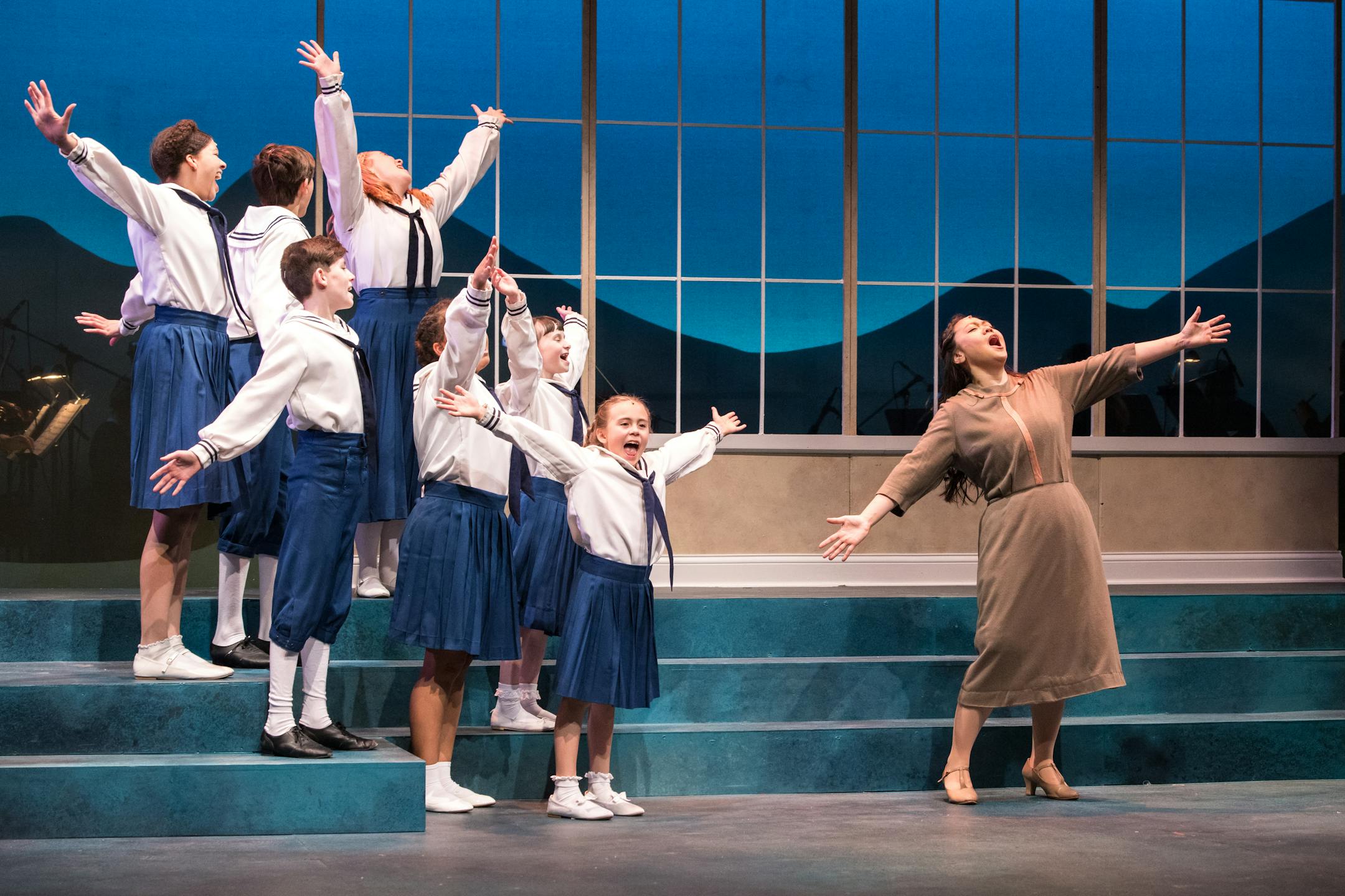 He also finds a balance between being too spare on the one hand and cluttering the staging with theatrical froufrou. Set designer Katie Phillips’ smart drops and simple furniture pieces gesture toward the various locales in the story about an Austrian family’s flight to freedom as Nazis take over their country. Costume designer Nat Koch-Smith has nattily attired the cast, all sharply lit by Karin Olson.