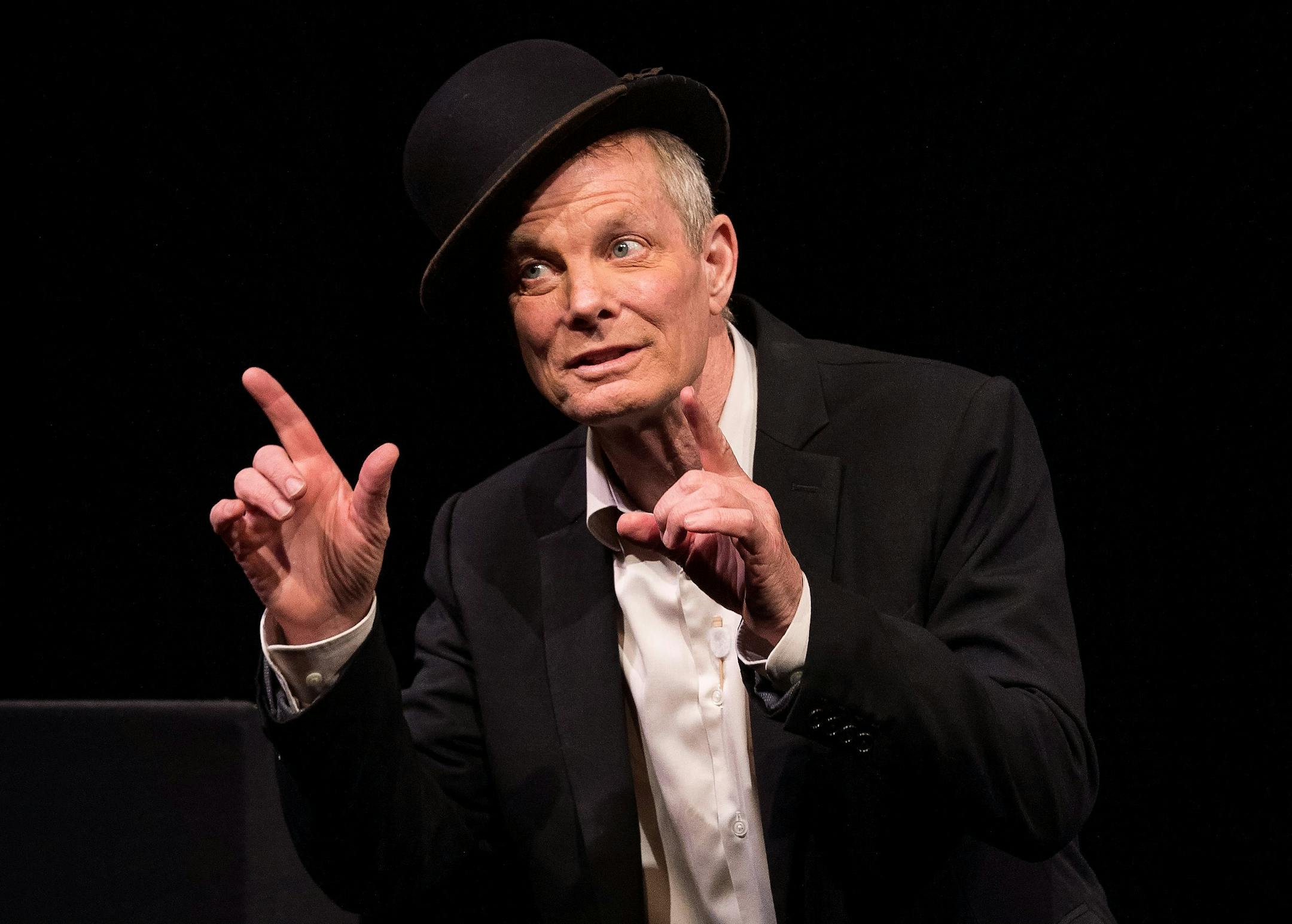 These voices course even now through the actor’s body and compel it to do unexpected things onstage. At the Guthrie, he puts his feet on the lectern. Sometimes he slowly slinks and rises behind a podium, as if going down and up an elevator. Other times, he lets his knees go all wobbly, intimating a Chaplin-esque duckwalk. Then he swings a cane like a golf club.