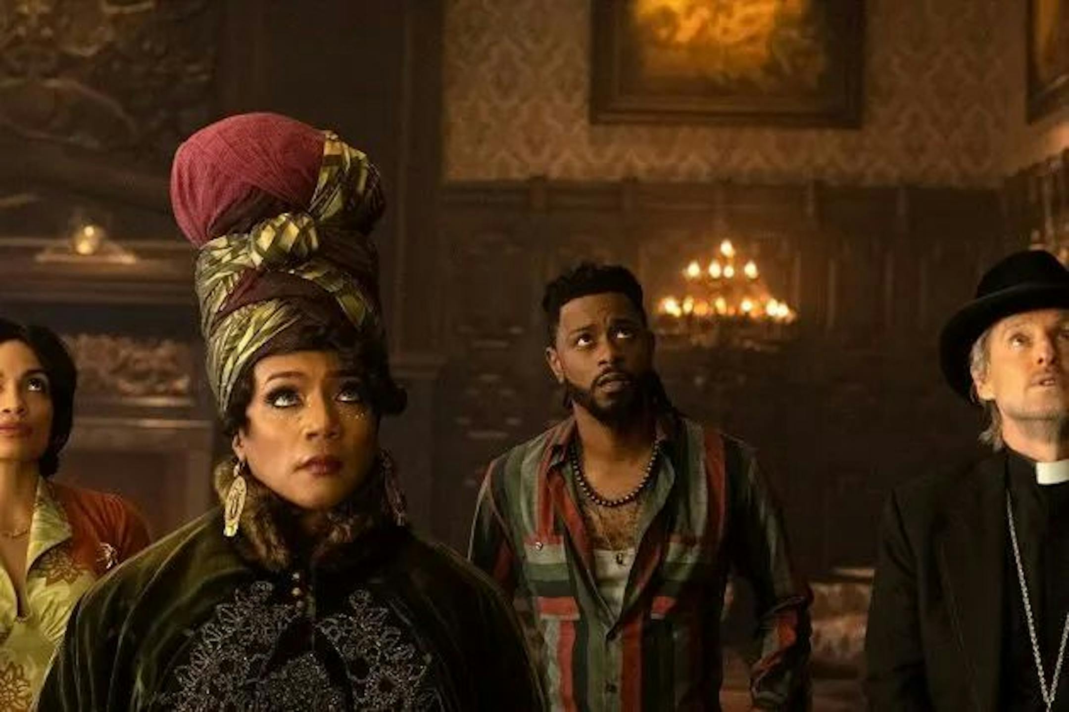Things are only marginally more lighthearted at the titular mansion, which has been purchased by a single mom (Rosario Dawson) and her sad-sack son (gifted, intuitive Chase Dillon), who plan to turn it into a bed-and-breakfast. They move into a home where every piece of furniture looks like someone died on it, quickly discover the ghosts and then reach out to a ragtag bunch of kooks to help them exorcise the place. The kooks include a man of the cloth played by Owen Wilson, a wacky medium played by Tiffany Haddish, another medium played by Jamie Lee Curtis and someone who yells a lot played by Danny DeVito.