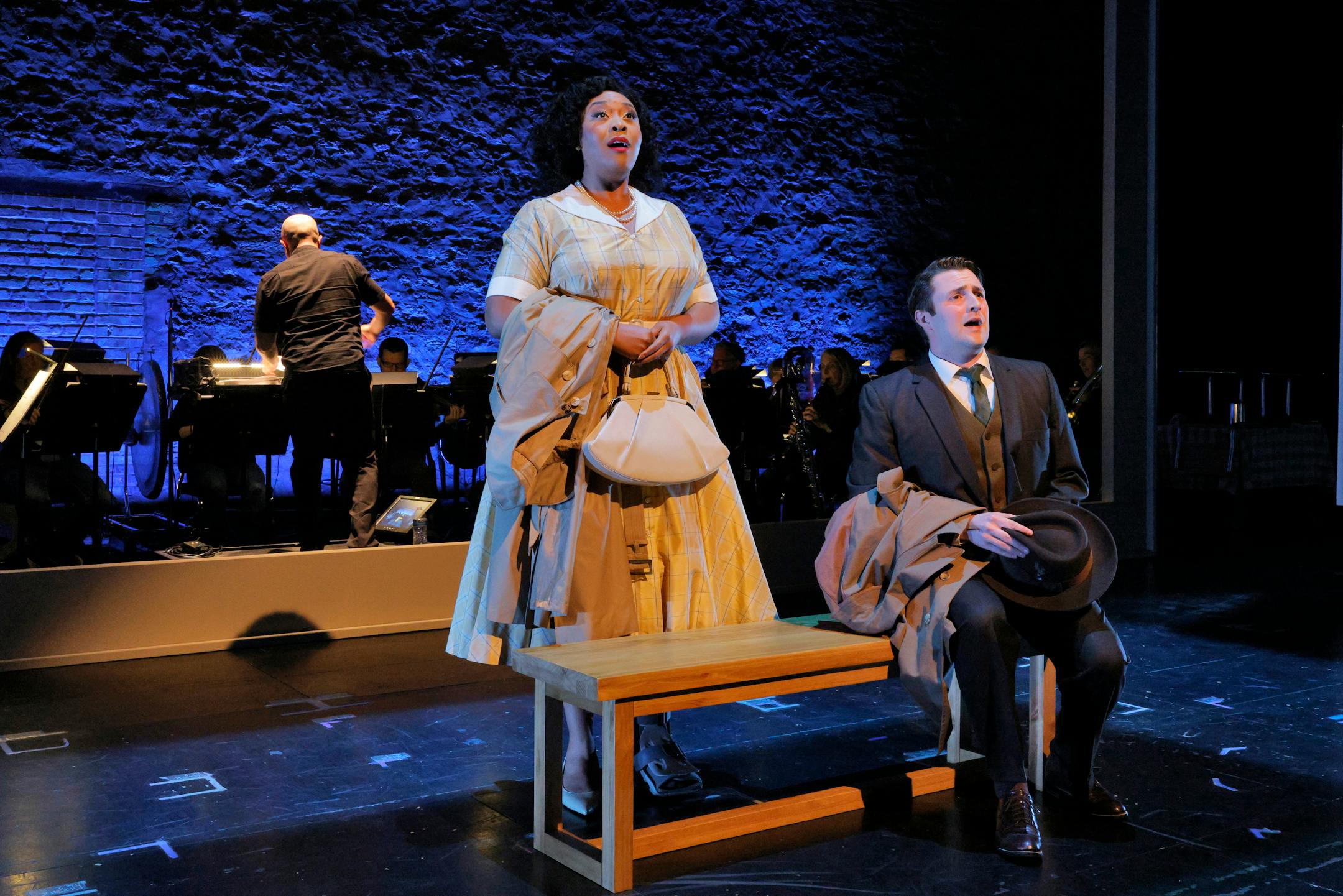 They lead us to the “little white house” where Sam and Dinah drift between tense duets and internal monologues in which they mourn their marriage’s decline and express their own desperate desire for connection. A sad beauty emerges in mezzo-soprano Zoie Reams’ moving performance as Dinah, her arias offering a preview of the aching sorrow that would suffuse Bernstein’s ballads in “West Side Story” and the rapid-fire storytelling style of his “Candide.”