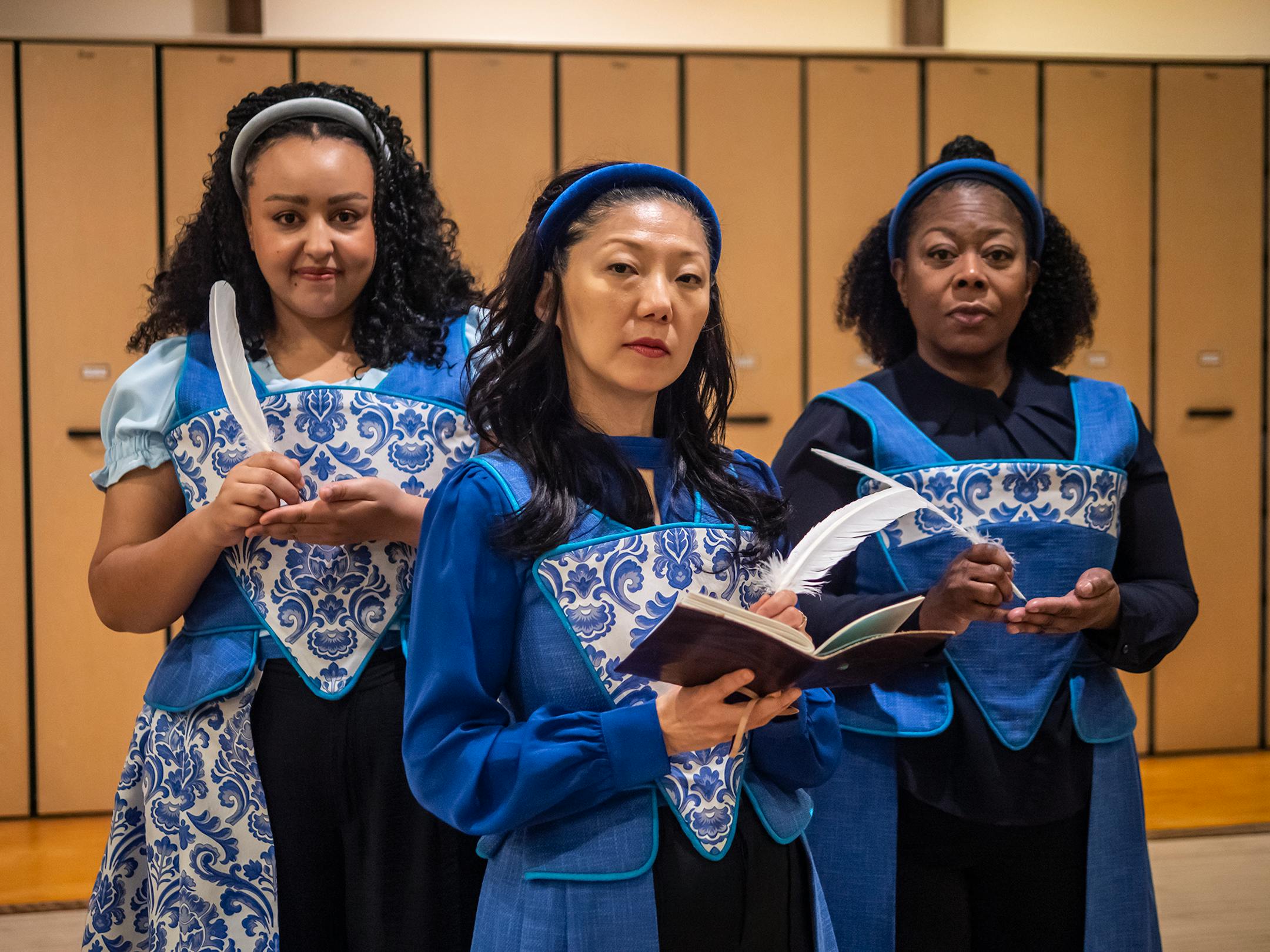 Bassano buried much of her liberation ideas in the religious text she wrote to get past the censors. Malcolm's play nods to that by having the author played by a trinity of actors: bright Marisa Tejeda depicts the young Emilia; solid, fearless Sun Mee Chomet plays middle period Emilia; and self-assured Greta Oglesby comes in as the older, wiser Emilia.