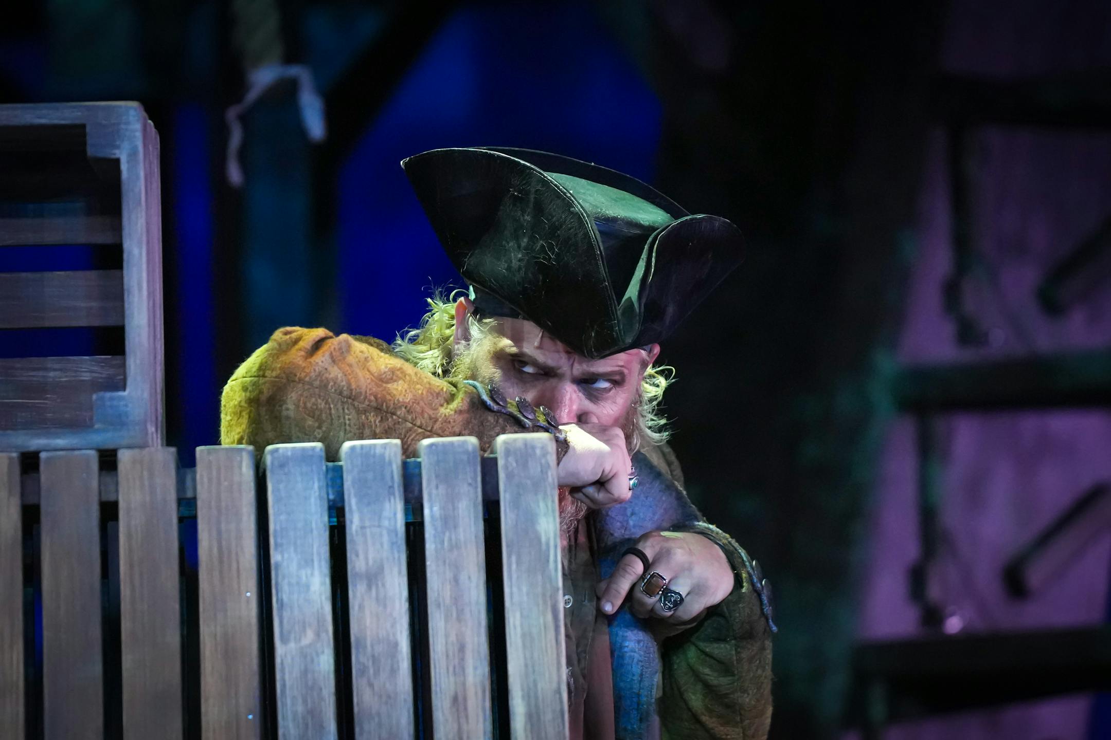 In director Rick Dildine’s production that opened over the weekend, Jim (the gifted Truman Bednar alternates the role with Mason Yang) sees firsthand the lack of honor among buccaneers. His mentor and father figure, Long John Silver (Reed Sigmund), has interests, not friends, and would readily unalive an ally to get what he wants.