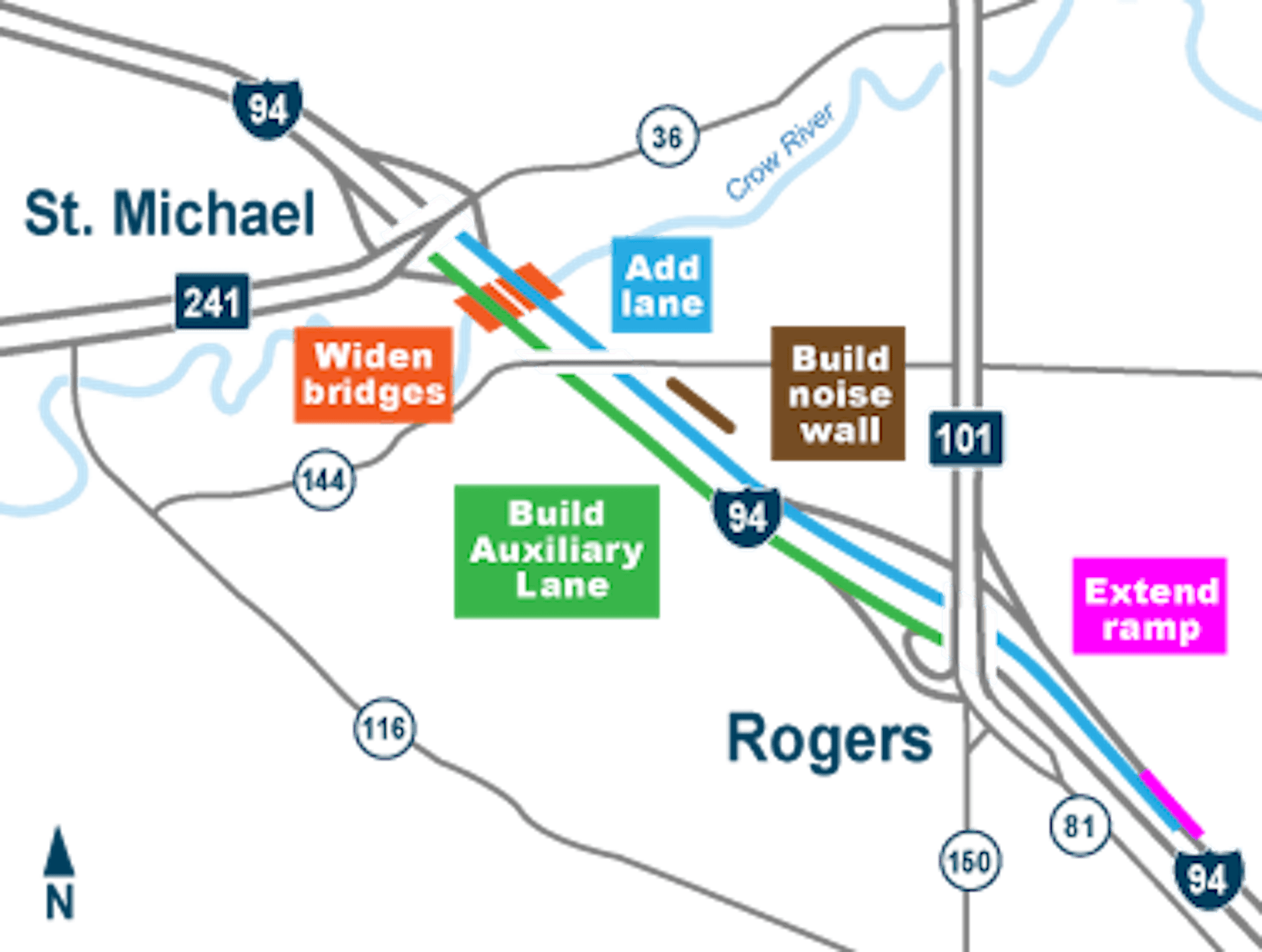 The $28.3 million project will make the segment three lanes in ech direction. It also will extend the exit ramp from westbound I-94 to Hwy. 101 in Rogers. Bridges at the Crow River will be widened and a noise wall will be built on the north side of I-94 at the Rogers exit.
